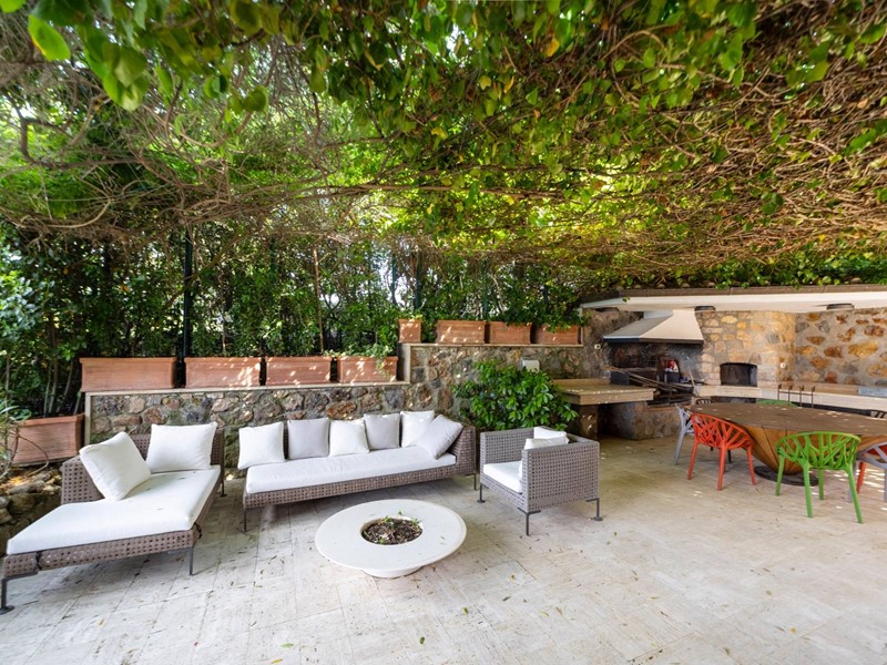 Attorno alla Villa, l'esterno si trasforma in un vero e proprio angolo di paradiso, ampie zone pavimentate con barbecue, terrazzamenti arredati con divani e sdraio, giardino a prato inglese, siepi curate, piante e fiori, oltre ad alberi ad alto fusto. Elemento distintivo è la piscina, circondata da una grande zona prendisole, ambiente docce e zona servizio.