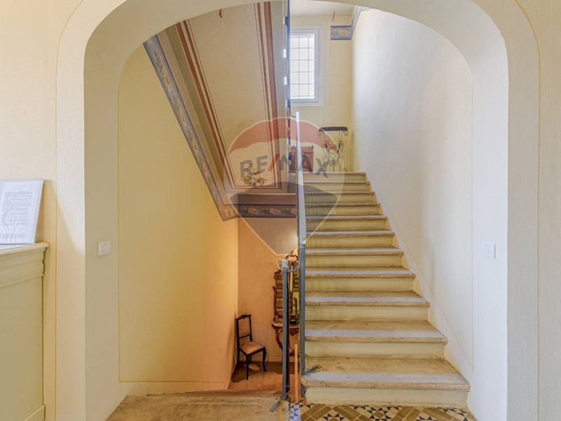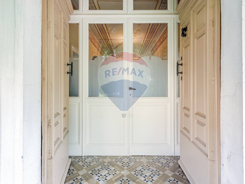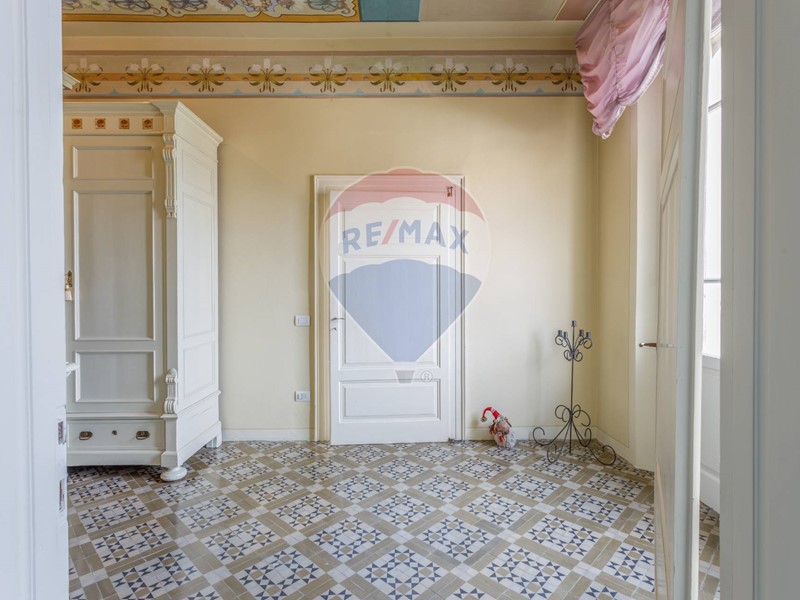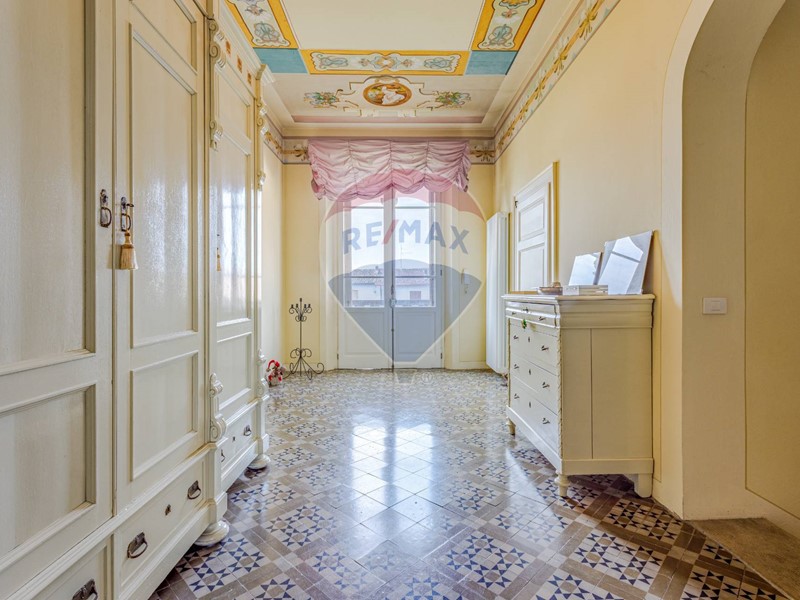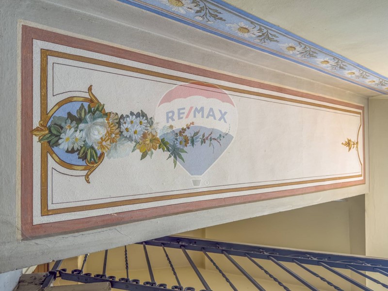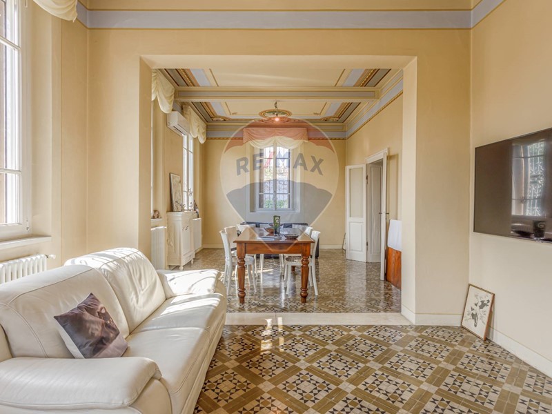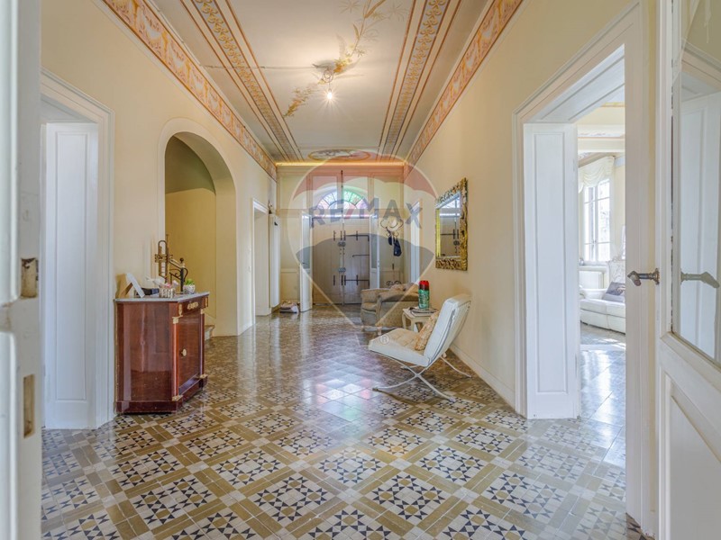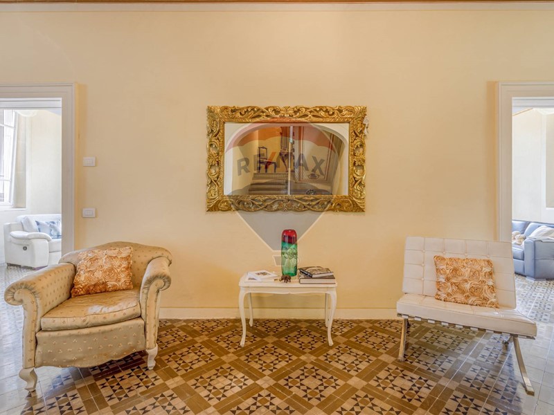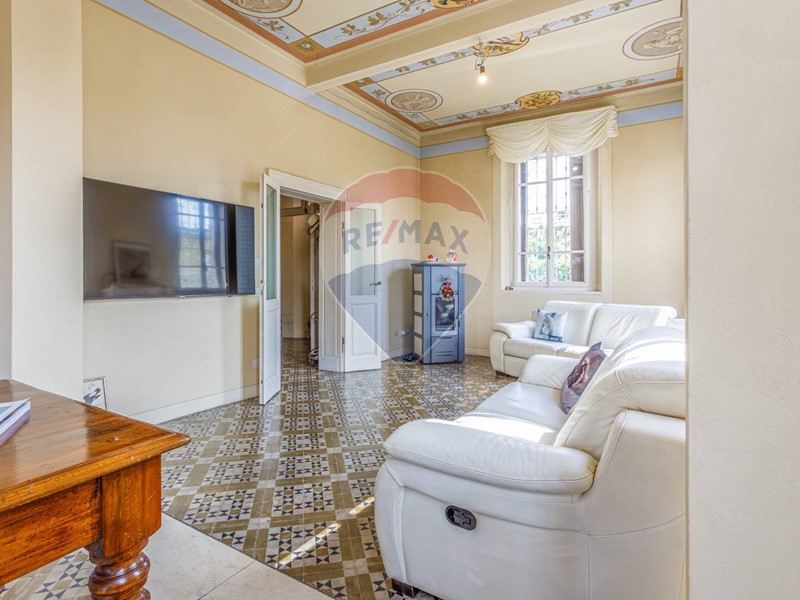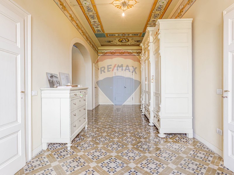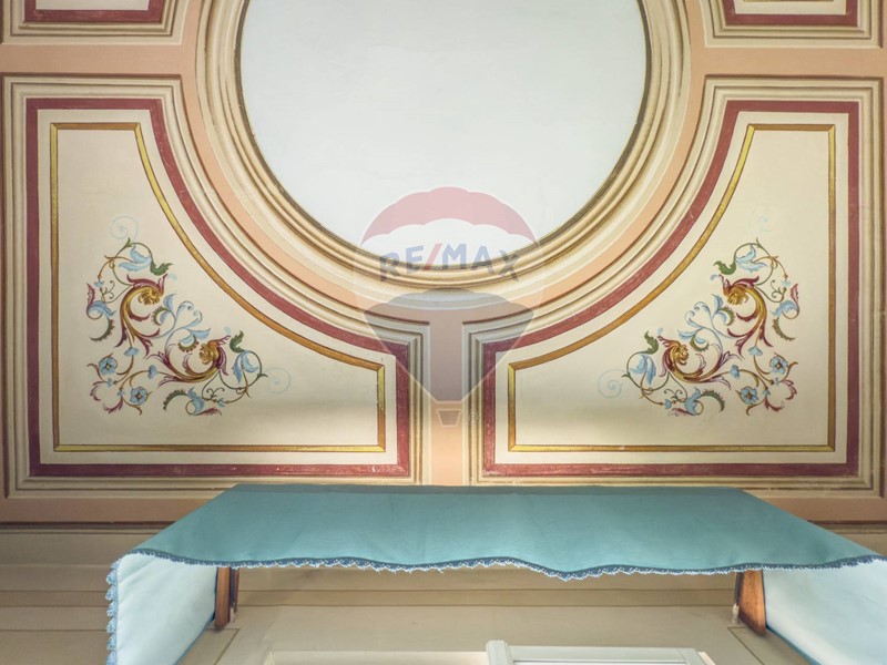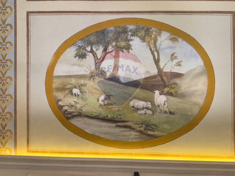L'ingresso principale conduce ad un'ampia zona living, caratterizzata da pregiati pavimenti e soffitti alti con eleganti affreschi e cornici.