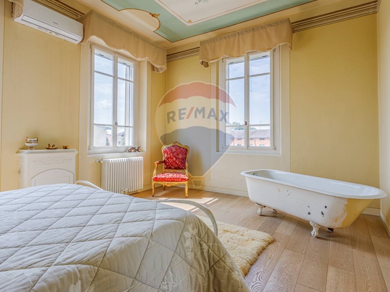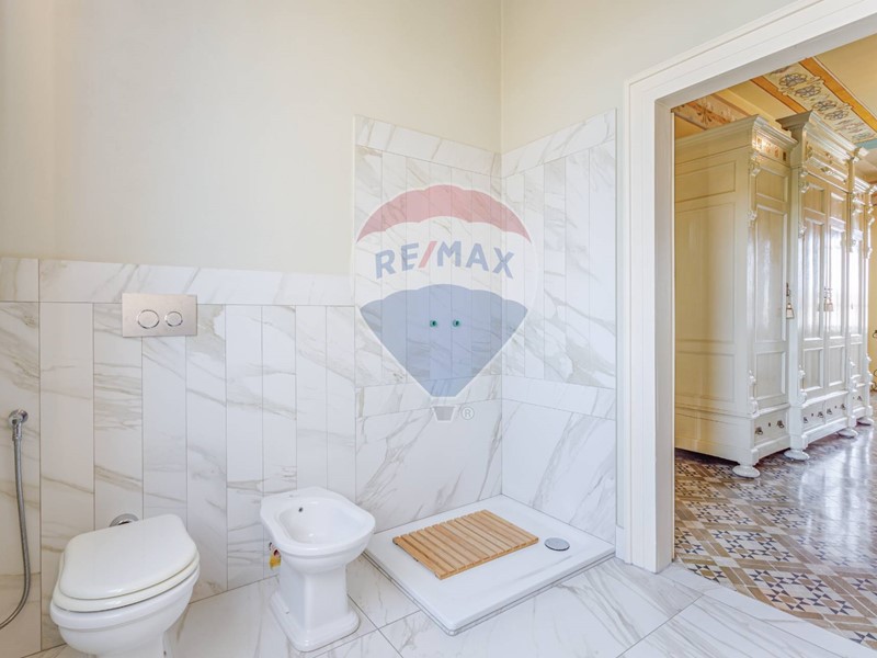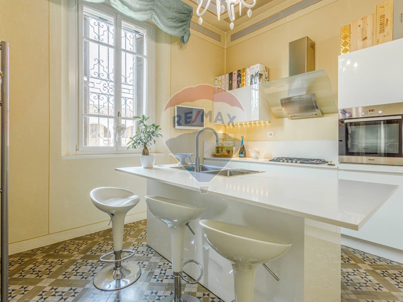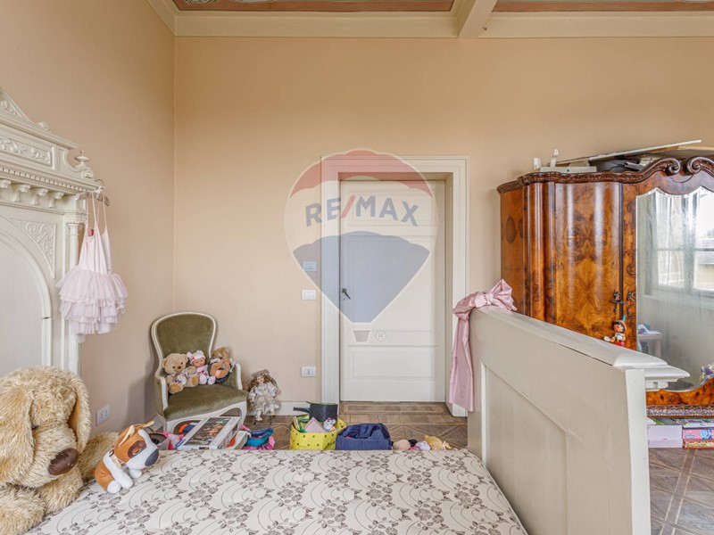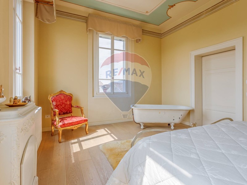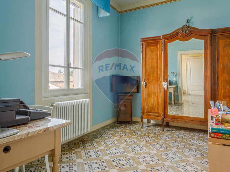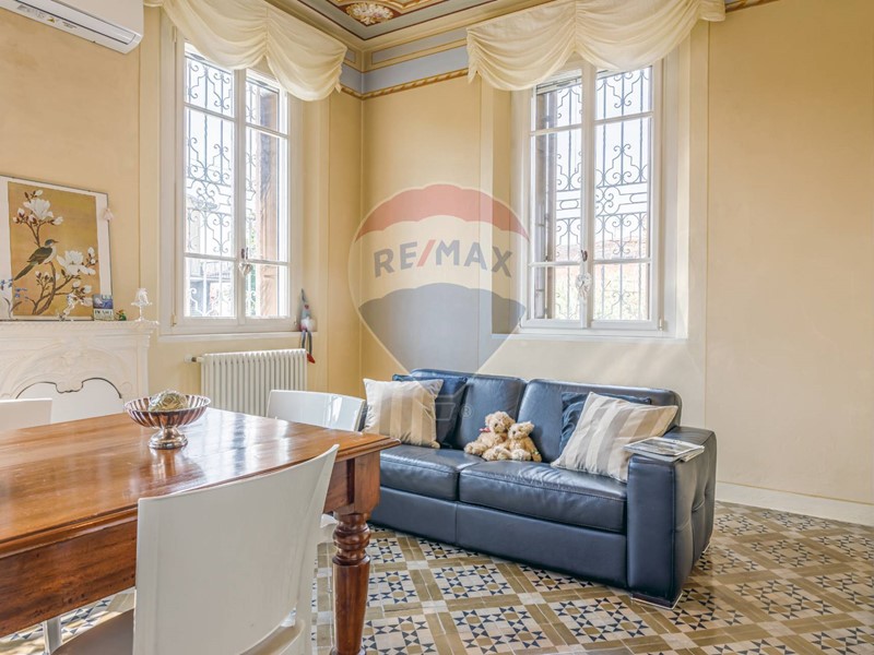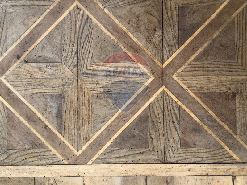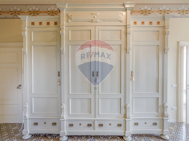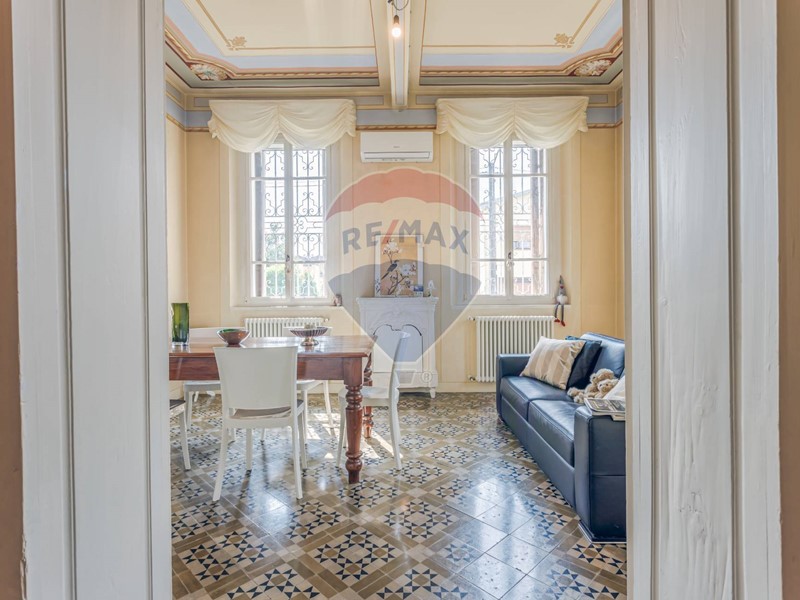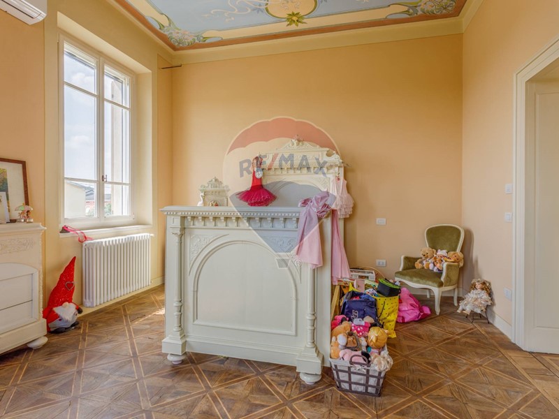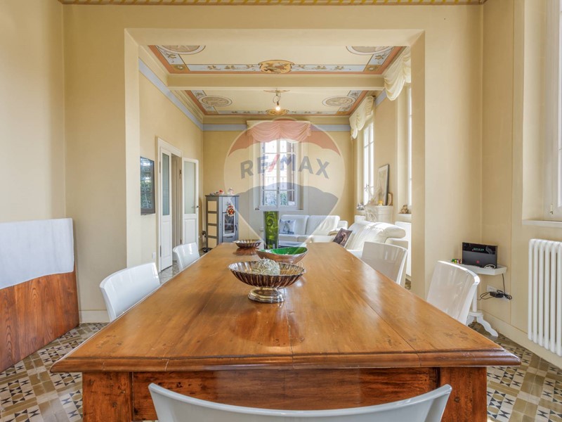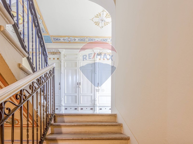 L'ingresso principale conduce ad un'ampia zona living, caratterizzata da pregiati pavimenti e soffitti alti con eleganti affreschi e cornici.