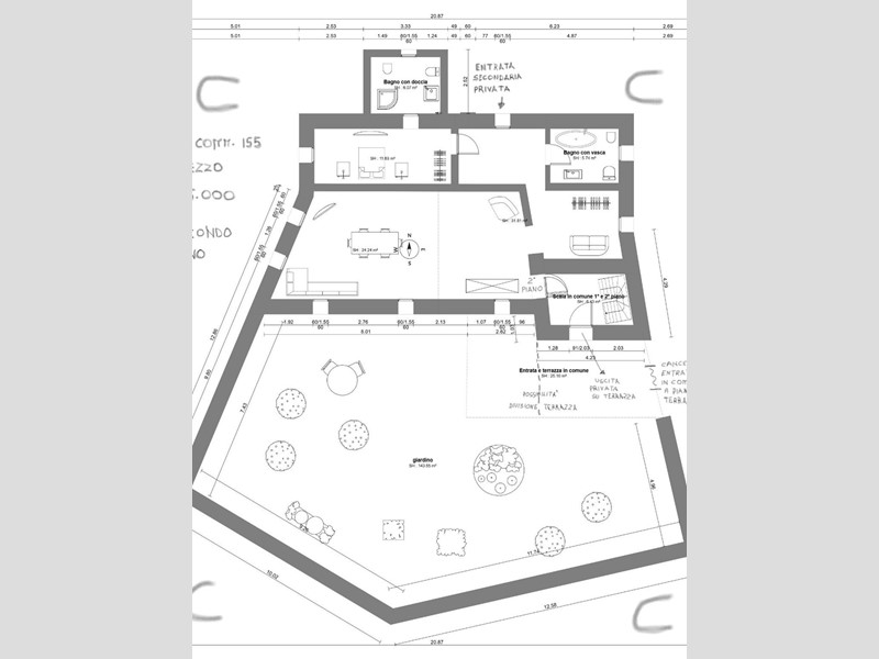 In vendita a Carrara, nella zona di Fossola, proponiamo una porzione di casa con ingresso privato indipendente. L'immobile, situato al piano terra, si compone di 4 locali per un totale di circa 80 mq ed è in buone condizioni generali. Il piano terra ( che sulla facciata diventa piano primo in virtù dell' inclinazione del terreno ) si trova all' interno di una villa storica con vista mare. La zona è quella di Fossola sulla prima collina a 6 minuti dalle spiagge di Marina di Carrara. La porzione di casa in oggetto ha una doppia entrata, una in comune ed una indipendente; si entra subito in un ampia e luminosa sala con pavimenti in marmo calacatta oro e mobili centenari, da qui si accede ad una cucina ampia con adiacente il bagno di servizio; una seconda uscita dalla sala principale porta ad una stanza adatta ad essere adibita a camera da letto, accanto alla quale troviamo una seconda stanza perfetta per essere trasformata in un ampio bagno padronale. Vista l'ampiezza della sala principale è possibile ricavarne due locali aggiuntivi. In uso comune con l'abitazione del piano superiore vi è una splendida terrazza panoramica in stile coloniale di circa 25 mq, con la possibilità di essere divisa con entrate separate, la parte destinata a questa abitazione sarebbe direttamente dalla propria sala. Completano la proprietà un piccolo ripostiglio e due parcheggi privati adiacenti alla casa. La zona è silenziosa e tranquilla sia di giorno che di notte. La villa è già suddivisa al catasto in tre unità abitative ed essendo tutta in vendita c'è la possibilità di spartizione o assegnazione completa di varie parti esterne come il giardino la cantina e la terrazza. Possibilità inoltre di acquistare non solo questa ma due unità abitative a scelta, oppure la villa completa ( vedere planimetrie ). La planimetria di riferimento per questa porzione di villa è quella contrassegnata dalla lettera "B". Superficie commerciale totale mq. 160 ( abitativo 80 mq, cantine adiacenti 25 mq ). Il prezzo di vendita è di euro 185.000.