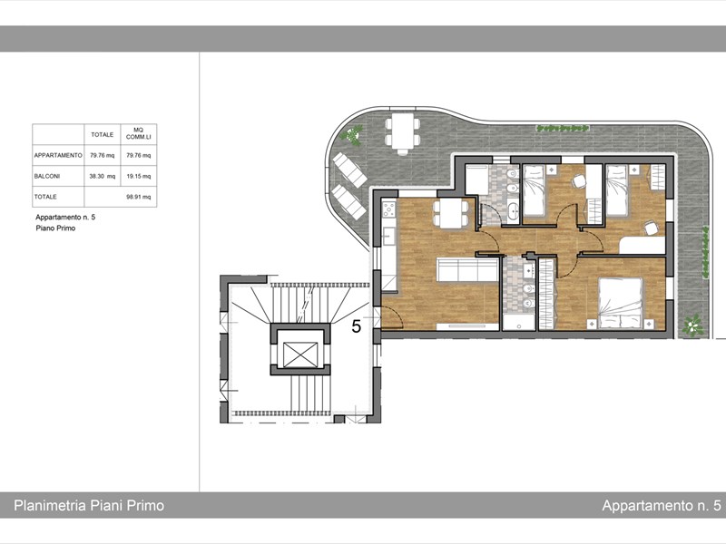 Situato al primo piano, l'appartamento è composto da zona giorno con cucina a vista, comodo disimpegno che conduce alla zona notte dove troviamo tre camere da letto, una delle quali matrimoniale e due bagni. L'ampio balcone perimetrale permette di poter accogliere i propri ospiti per cene all'aperto o da dedicare al proprio relax.