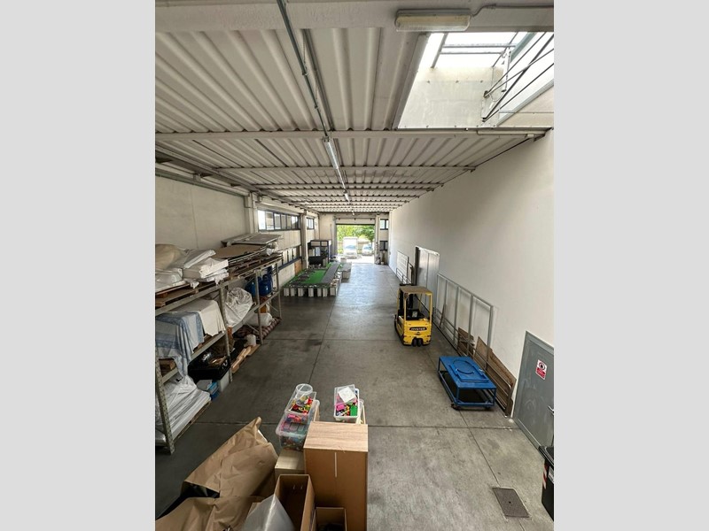 -Piano terra: parcheggio privato e grande piazzale con una tensostruttura molto ampia uso magazzino; da un lato si accede al capannone tramite una porta con maniglione antipanico, dall’altro lato si accede da un portone industriale a scorrimento (con all’interno sistema di porta ad avvolgimento rapido), apribile anche dall’esterno perché dotato di telecomando. All’interno vi è un grande spazio diviso a metà da una parete di cartongesso (facilmente abbattibile per creare uno spazio unico) di altissima qualità con un grande portone scorrevole e due porte con maniglione antipanico/antincendio. Una parte era adibita a lavorazione pellame PCT, l’altra (condizionata), allo sviluppo di piastre per stampare. Completa un piccolo ufficio e uno spogliatoio con doppio bagno. A parte, vano scale e ascensore.