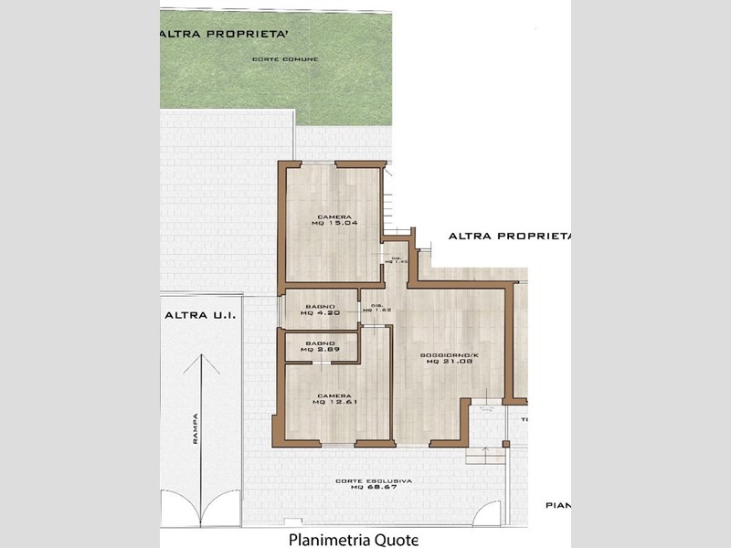 All'esterno troviamo una corte esclusiva di 68 mq con porticato, perfetta per godersi momenti di relax all'aria aperta o cene estive con amici e famiglia.