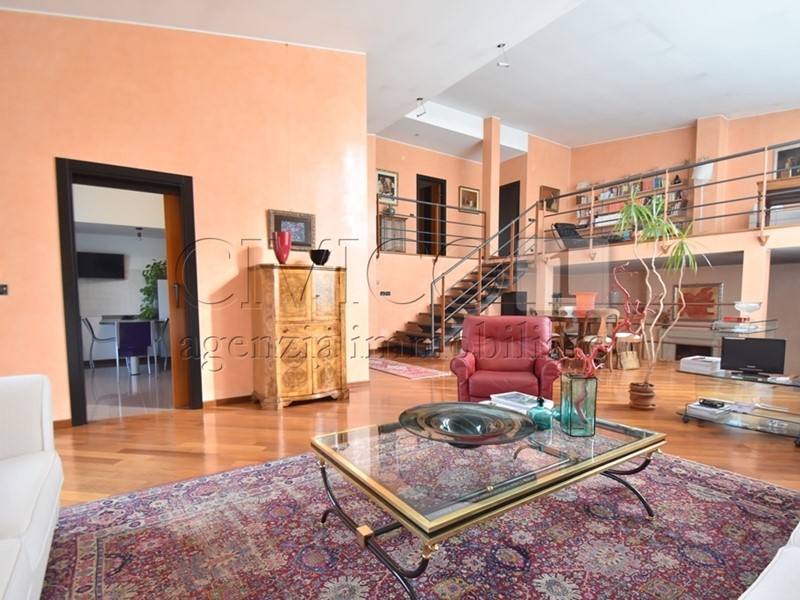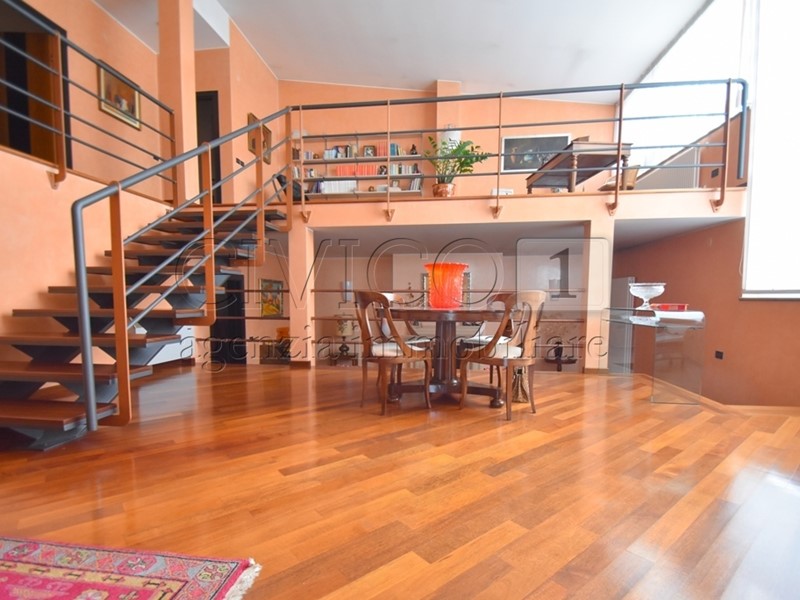 Salendo al piano superiore non si può che rimanere estasiati dalla scala completamente rivestita dal legno, elemento essenziale e mai invasivo, dove ci accoglie un soppalco ad uso studio/libreria che domina sulla zona giorno (possibile ricavare la terza camera date le ampie dimensioni), oltre le due camere matrimoniali (entrambe con accesso al terrazzo) e secondo bagno con vasca idromassaggio.