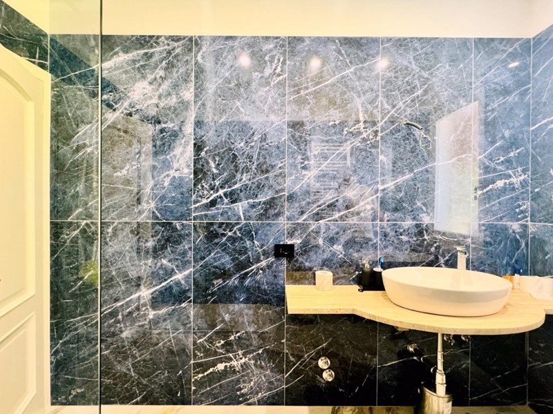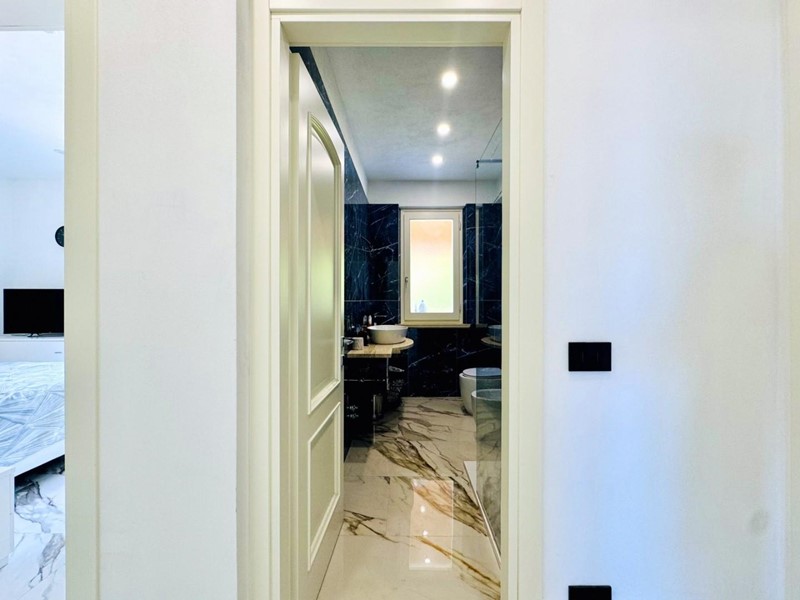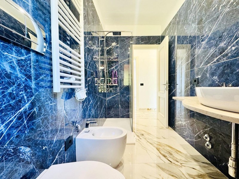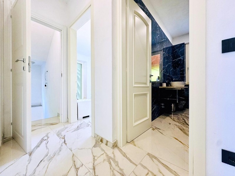 Attraverso la scala in marmo si raggiunge il piano superiore. Le camere da letto a questo livello sono tre, ma la committenza ho optato per ricavare una stanza padronale molto grande facendo sì che questo piano ne ospiti due. I bagni al servizio degli ospiti sono due, uno con vasca idromassaggio ed uno con la doccia. Apprezzabile la seconda terrazza che domina il giardino.