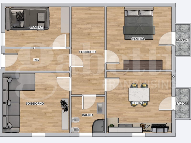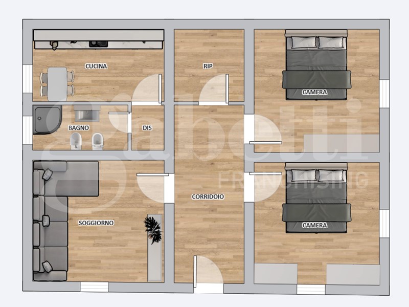 Ogni unità ha soggiorno, cucina abitabile, due camere da letto e bagno.