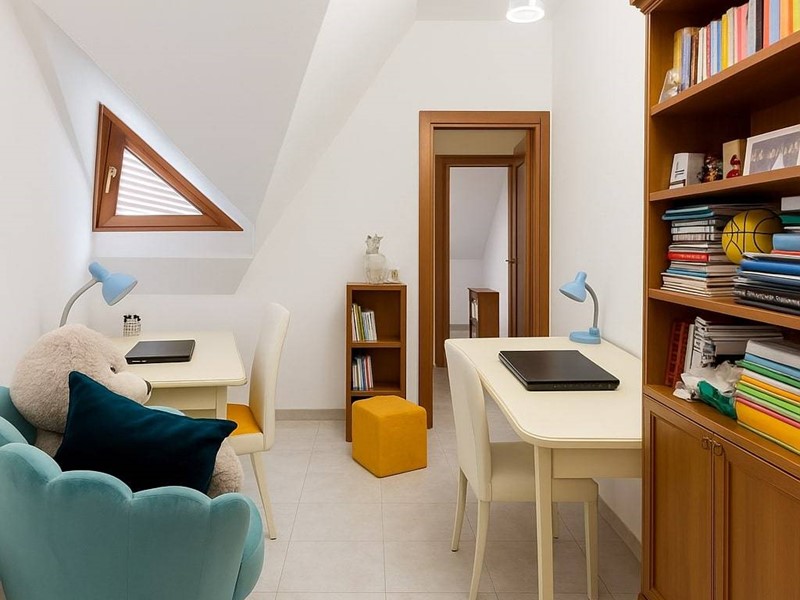 La zona notte è composta da tre comode camere da letto e un bagno finestrato con vasta, mentre una quarta cameretta, utilizzabile anche come studio, si affaccia sulla zona giorno, arricchita da una comoda cucina abitabile, secondo bagno, e ripostiglio.