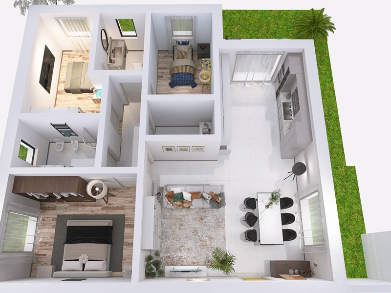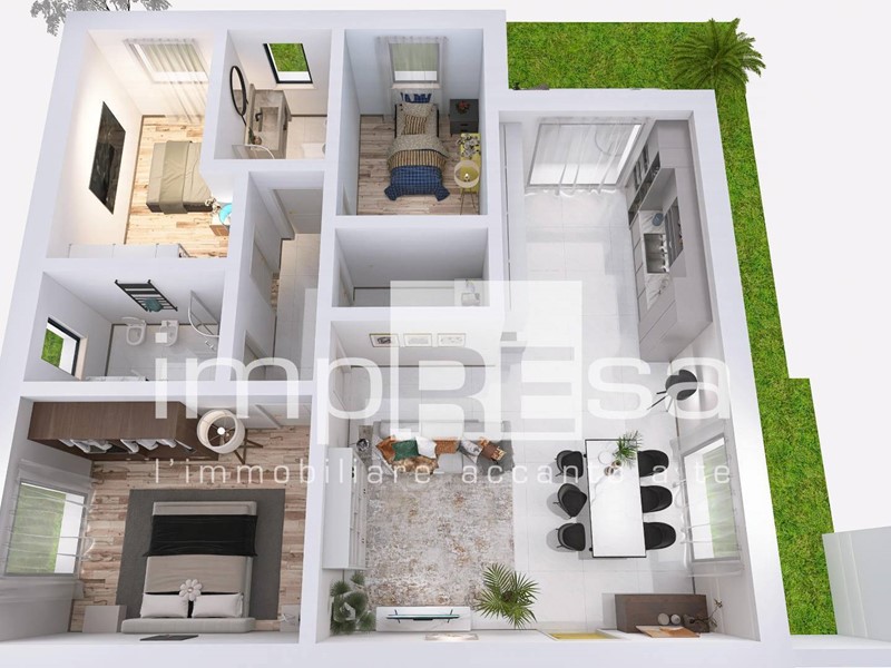 L'appartamento si compone di un ampia zona giorno openspace di quasi cinquanta metri quadrati, con vista sul giardino, dalla quale attraverso un disimpegno si accede alla zona notte composta di tre camere di cui una matrimoniale, due bagni e una comoda lavanderia.