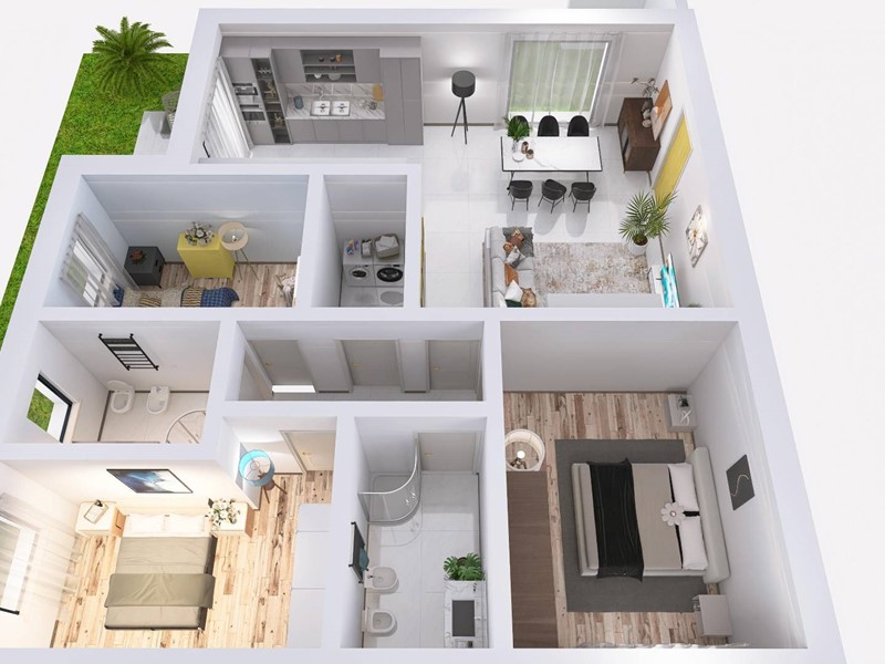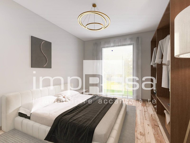 Preganziol zona centrale, in vendita appartamento piano terra con giardino, tre camere, due bagni, lavanderia, garage e posto auto, in elegante palazzina di solo sette unità, nuova costruzione in classe A4 consegna prevista fine 2025.