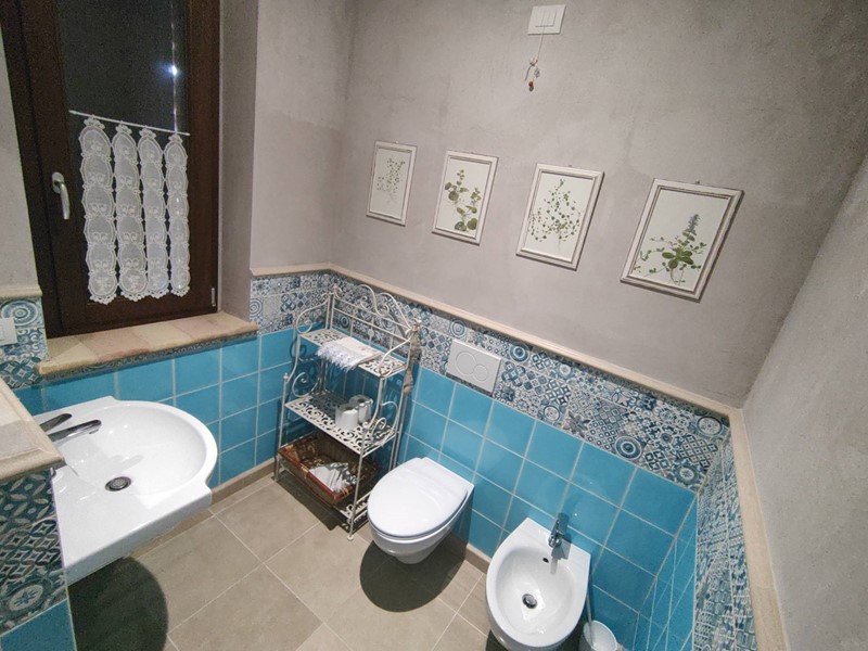 Al piano superiore, accessibile tramite una comoda scala interna, troviamo 3 camere da letto matrimoniali , ognuna delle quali dotate di bagno privato provvisto di doccia ; una camera doppia con bagno privato esterno alla camera ; una cameretta per un totale di 9 posti letto. Viene offerto il servizio WI-FI, il cambio biancheria settimanale e la pulizia delle camere con bagno.