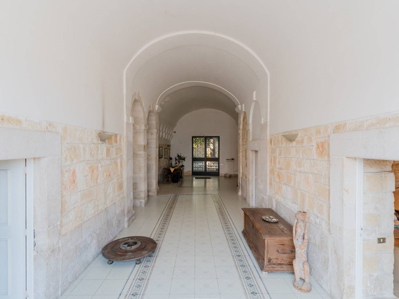 Il piano terra accoglie un monumentale ingresso voltato che si apre sul patio interno, una tavernetta in pietra con camino, diversi ambienti di servizio e una camera con accesso diretto alla storica cisterna sotterranea, ancora oggi perfettamente funzionante. Il primo piano, altrettanto suggestivo, ospita una cucina con camino, un salone di rappresentanza, tre camere da letto, due bagni e unampia terrazza panoramica di oltre 160 mq, da cui si ammira una vista libera fino al mare, distante appena 700 metri in linea daria.