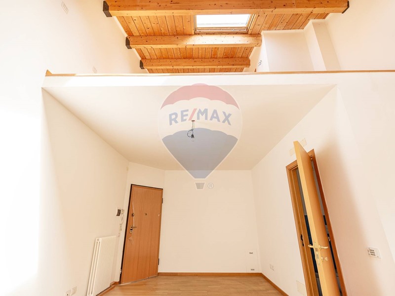 L'ingresso si apre su una zona giorno in open space, composta da cucina e soggiorno, caratterizzata da parquet caldo e moderno, infissi in PVC con doppio vetro e finiture curate. Le travi a vista e i due velux a gestione elettrica donano luminosità naturale e un tocco di accoglienza in stile contemporaneo.