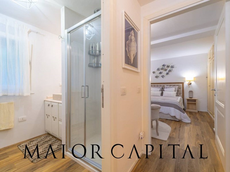 Distribuita su due livelli, la villa è suddivisa in due appartamenti indipendenti, che la rendono la soluzione ideale per famiglie numerose, ospiti o per chi desidera un investimento da adibire a locazione di alta gamma. Il primo piano, al quale si accede tramite una scala esterna, ospita unampia veranda coperta, perfetta per pranzi allaperto e momenti di relax, da cui è possibile godere dell'ombra. Allinterno, unaccogliente zona living con divano in muratura si affaccia su una cucina a vista moderna, dotata di piano a induzione e attrezzature di ultima generazione. La zona notte include due camere matrimoniali: la prima con armadio a muro e tonalità pastello che amplificano la luminosità, la seconda con accesso diretto a una seconda veranda privata, arredata come area lounge, ideale per le serate estive. Completano il piano due bagni eleganti, rifiniti con rivestimenti effetto legno sbiancato e linee pulite.
