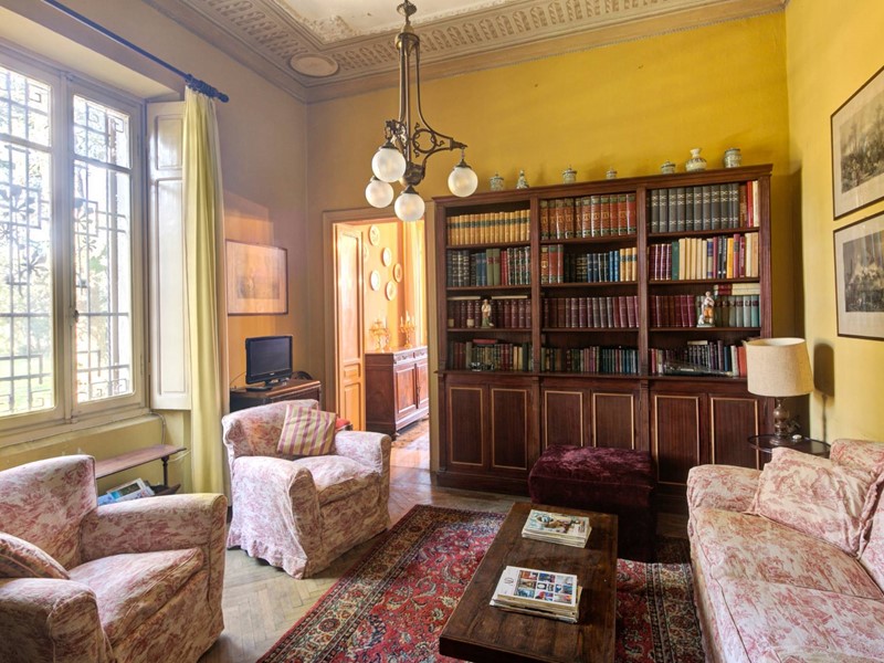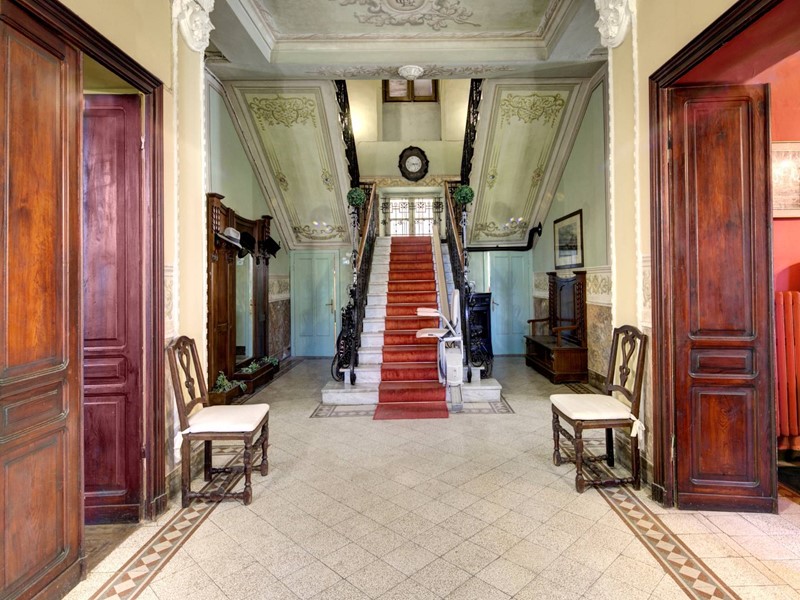 Ledificio è di tre piani, 800 mq circa : entrando, al centro limportante scalinata in marmo bianco. Al piano terra troviamo un ampio salone, un salotto con camino, ed a seguire la sala da pranzo, cucina, office, classica stireria, ed ulteriore stanza oggi adibita a biblioteca. Sempre al piano terreno abbiamo sotto le scale da una parte un bagnetto per gli ospiti e dallaltra lingresso della grande cantina. Al primo piano troviamo 8 camere da letto (due con balcone) e tre bagni. Al secondo piano, sette stanze e tre bagni di cui due molto grandi.