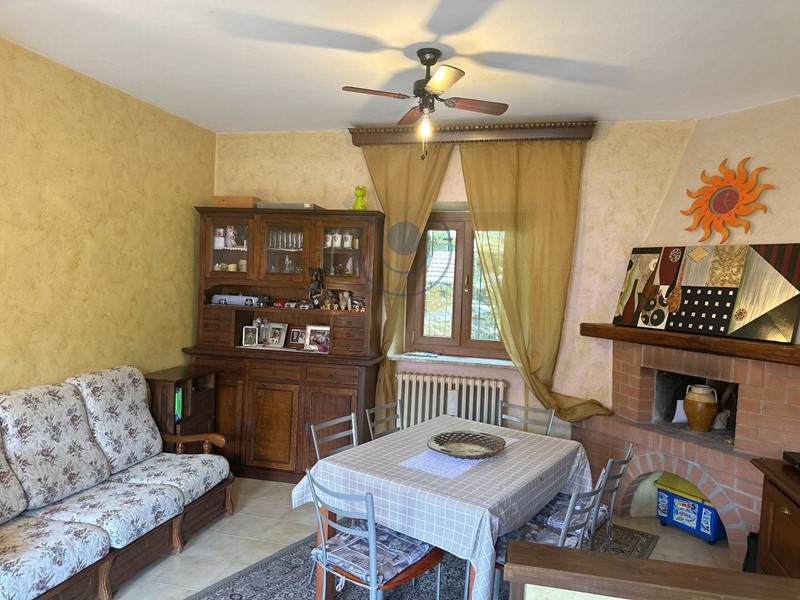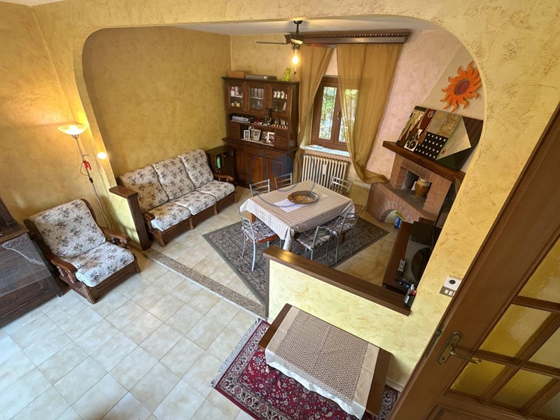 Ingresso sulla zona giorno composta da un ampio soggiorno con camino, cucina e bagno.