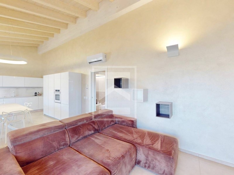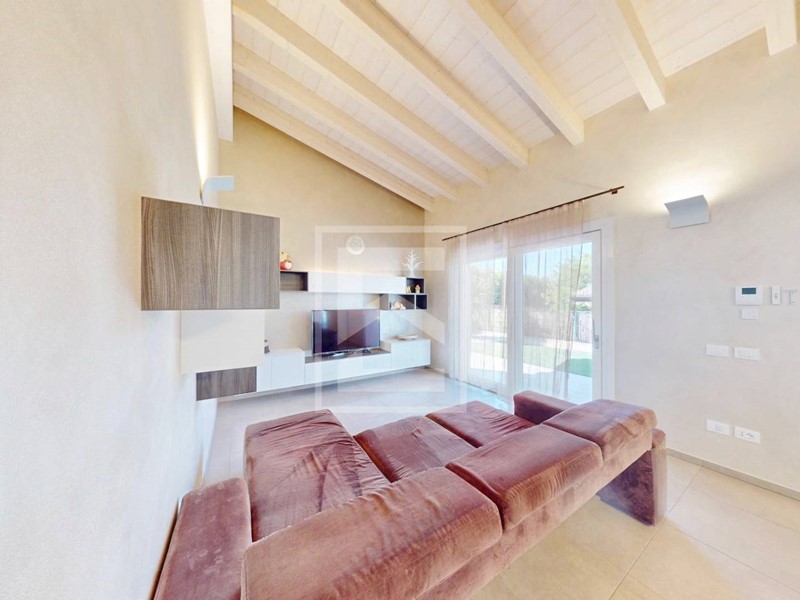 L'ingresso principale si apre su un luminoso e spazioso living dalle altezze importanti 4 mt con travi di legno sbiancate, dove ogni dettaglio è stato accuratamente studiato per creare un ambiente di pura eleganza e comfort. Le due grandi vetrate alzanti scorrevoli accedono direttamente al portico coperto dove poter godere di piacevoli pranzi all'aperto all'ombra della pergola bioclimatica dotata di illuminazione, tende frangisole e lamelle elettriche.