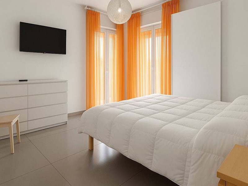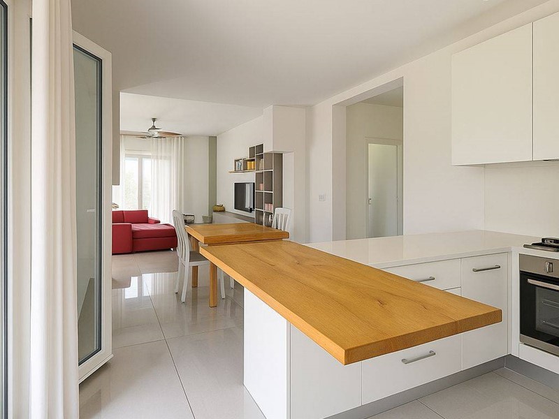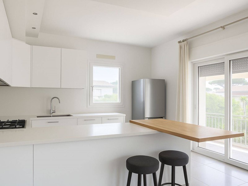 Lingresso principale conduce a un grande e luminoso soggiorno open-space, che accoglie una moderna cucina con penisola, ideale per momenti conviviali. Dal soggiorno si accede direttamente a un terrazzo arredato con tavolino e sedie, perfetto per colazioni allaria aperta o serate in compagnia.