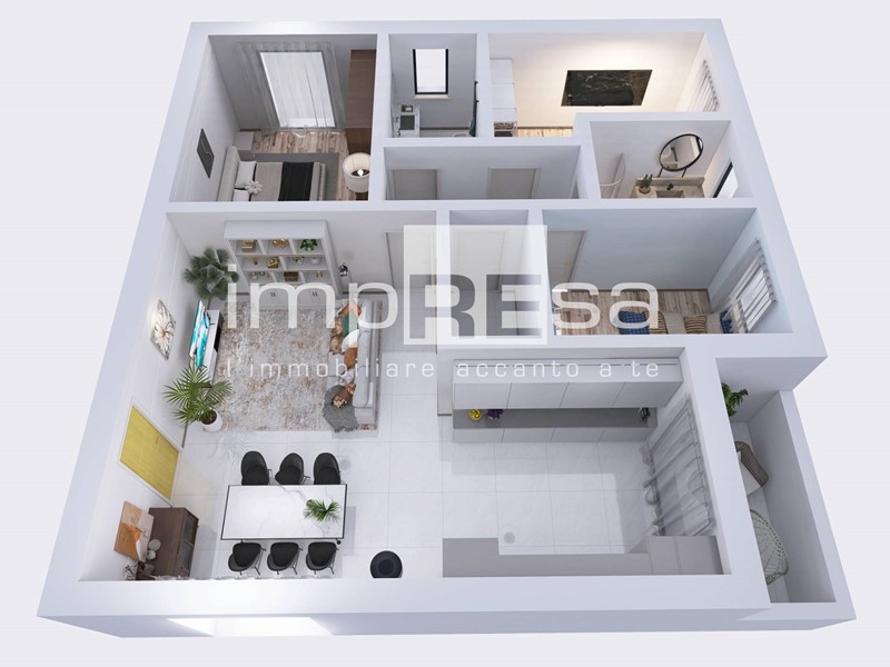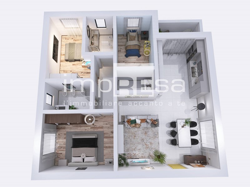 L'appartamento si compone di un ampia zona giorno openspace di quasi cinquanta metri quadrati, dalla quale attraverso un disimpegno si accede alla zona notte composta di tre camere di cui una matrimoniale, due bagni e una comoda lavanderia.