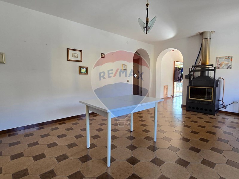 L'ingresso conduce sia alla cucina abitabile che ad un ampio soggiorno, con balcone, una termostufa da rifinire