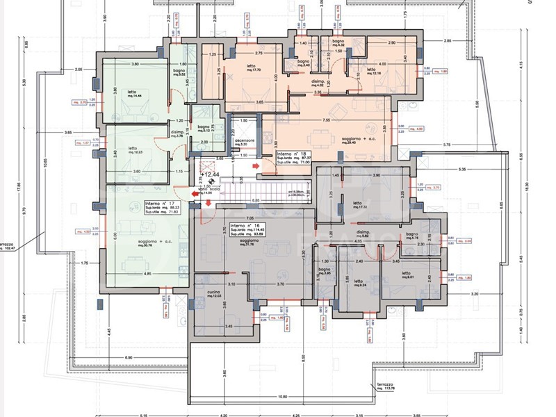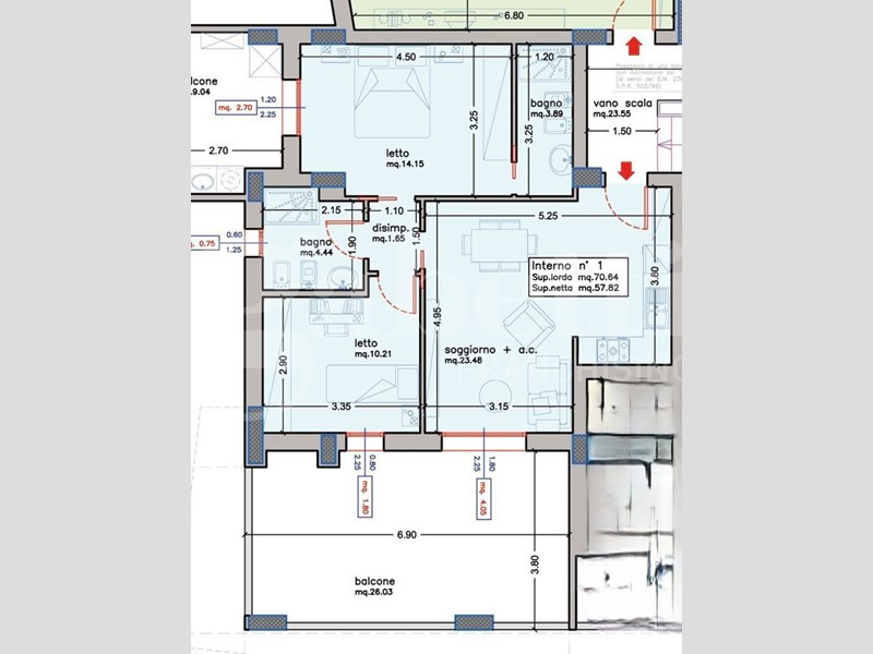 L'immobile esposto a Nord - Est internamente è così composto: ingresso su soggiorno con angolo cottura e accesso su ampio terrazzo, un ripostiglio, due camere una con balcone e due bagni.