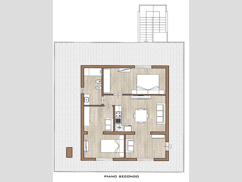 Dalla terrazza che circonda tutto l'attico, si accede al soggiorno e all'ampia cucina, 2 camere matrimoniali di cui una con anticamera/salottino, e bagno con doccia .