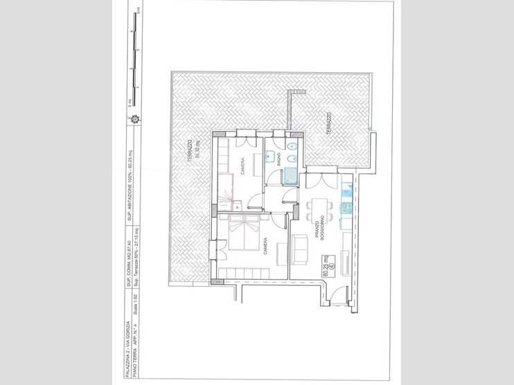 L'appartamento in questione, situato al piano terra, si compone di un ampio e luminoso soggiorno con cucina a vista e accesso su terrazzo abitabile perimetrale all'immobile, una camera matrimoniale, una cameretta e un bagno finestrato con doccia. La soluzione abitativa offre comfort e funzionalità, ideale per chi cerca un'abitazione moderna e ben progettata.