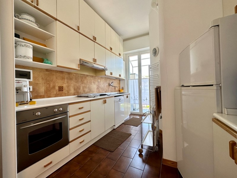 La cucina è separata con ottimi piani di lavoro. E dà l’accesso sul terrazzo di nord-est: all’orizzonte alberi, colline e Diano Castello.