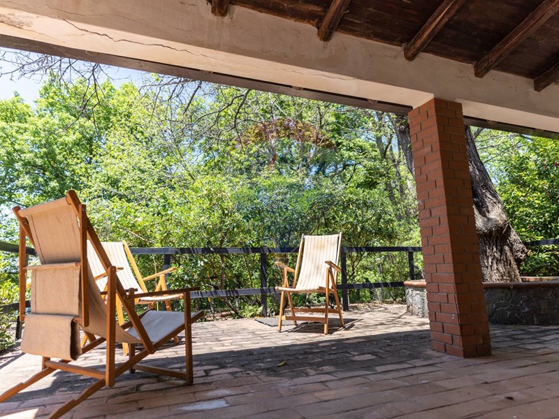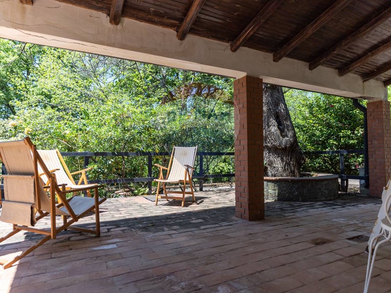 Ci accoglie una spaziosa tettoia in legno e tegole che copre un ambio terrazzino prospiciente sul giardino in posizione dominante.