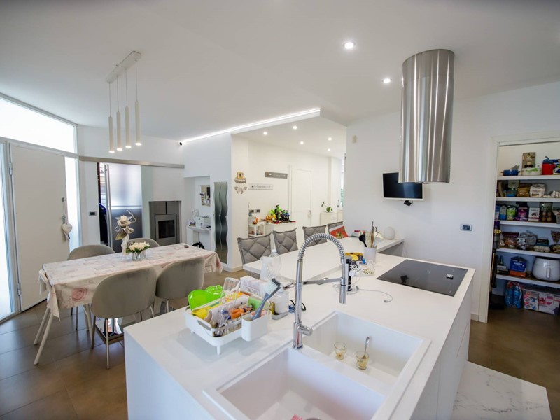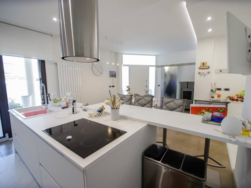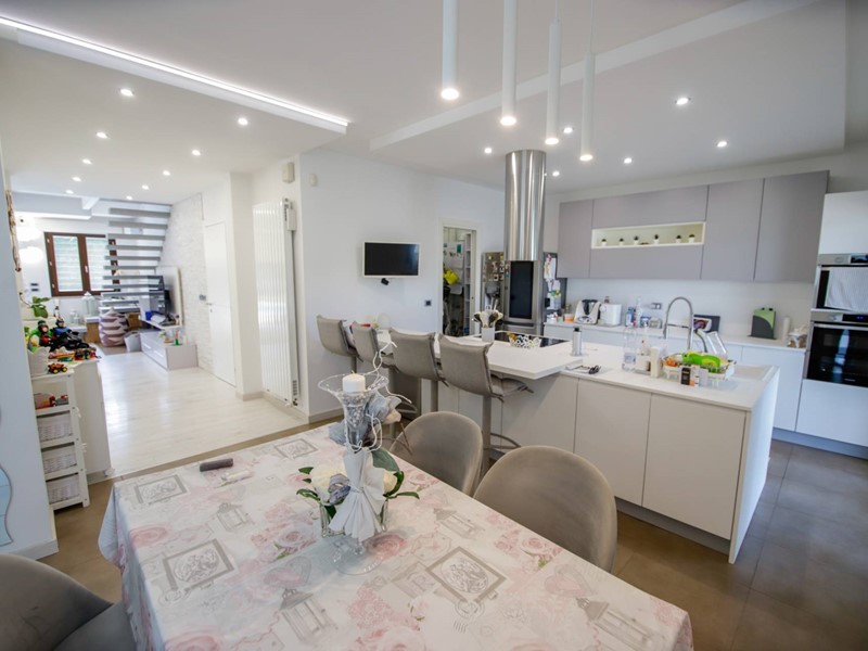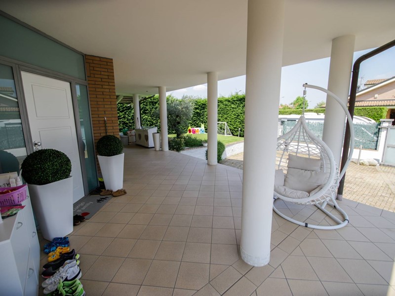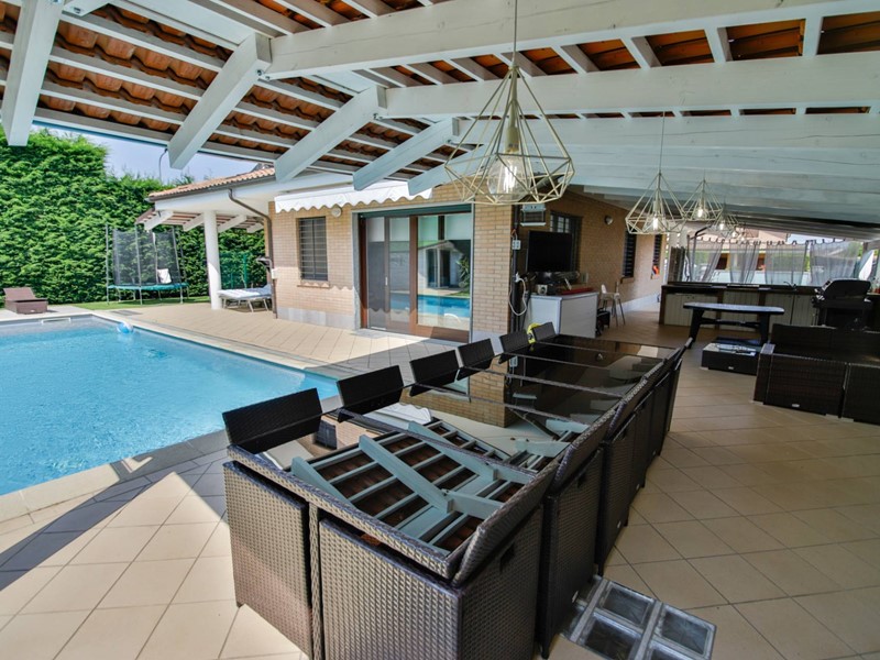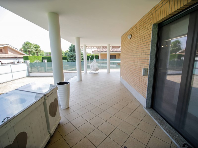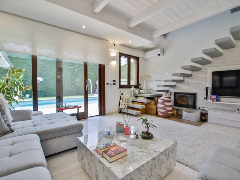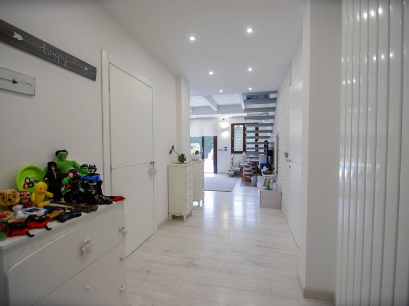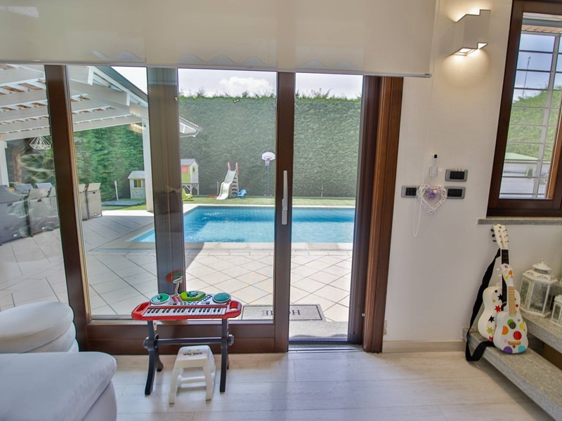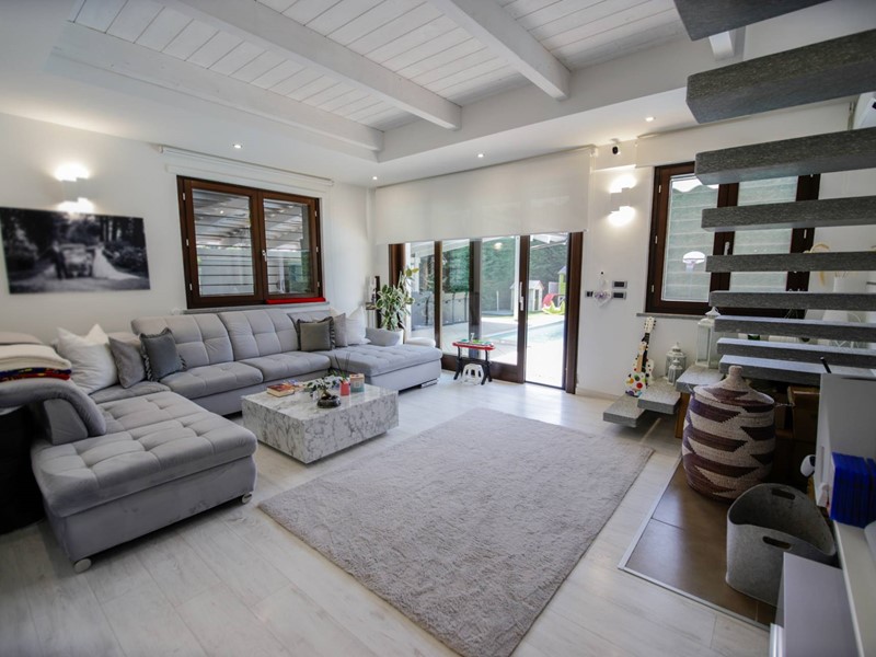L'abitazione è disposta principalmente su due livelli, ciascuno di circa 100m² ; al piano rialzato la zona giorno, caratterizzata dagli spazi generosi, ma soprattutto dalle ampie vetrate che rendono l'esterno parte integrante con gli interni: particolarmente suggestiva la vetrata del soggiorno, con affaccio diretto sulla piscina. Completa il piano una camera a disposizione, attualmente adibita a studio/ufficio, oltre al bagno, una lavanderia, un locale dispensa/ripostiglio e ad un comodo locale guardaroba;