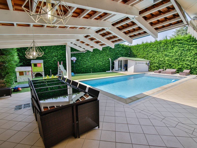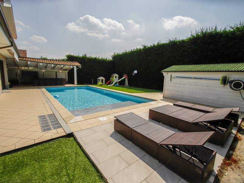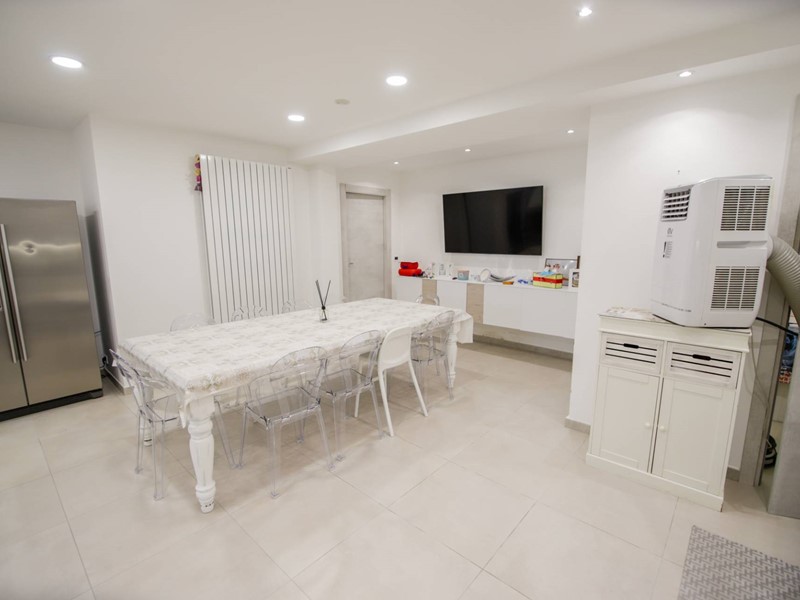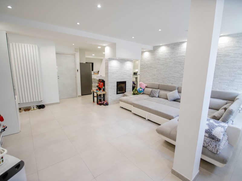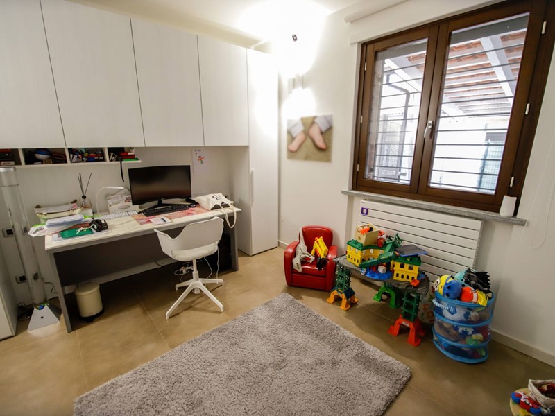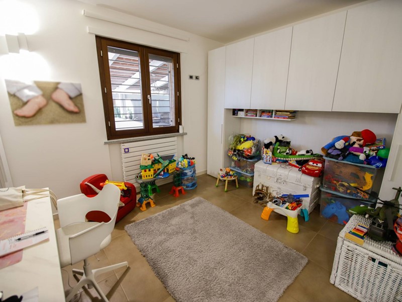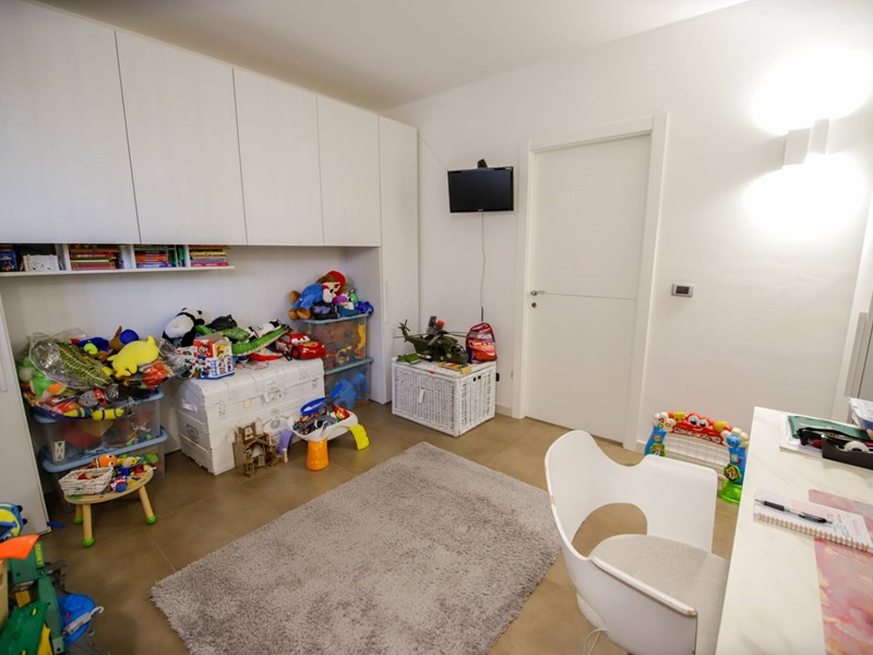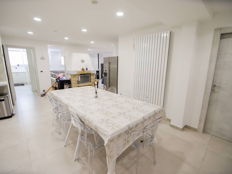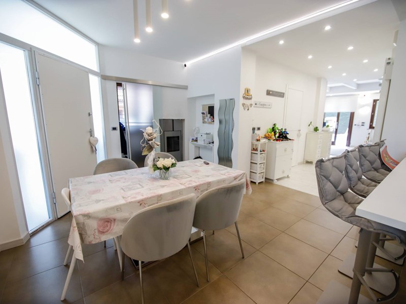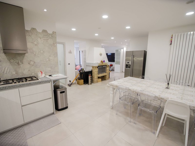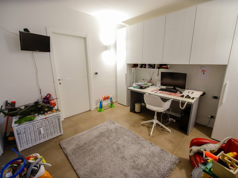 L'abitazione è disposta principalmente su due livelli, ciascuno di circa 100m² ; al piano rialzato la zona giorno, caratterizzata dagli spazi generosi, ma soprattutto dalle ampie vetrate che rendono l'esterno parte integrante con gli interni: particolarmente suggestiva la vetrata del soggiorno, con affaccio diretto sulla piscina. Completa il piano una camera a disposizione, attualmente adibita a studio/ufficio, oltre al bagno, una lavanderia, un locale dispensa/ripostiglio e ad un comodo locale guardaroba;