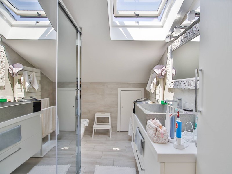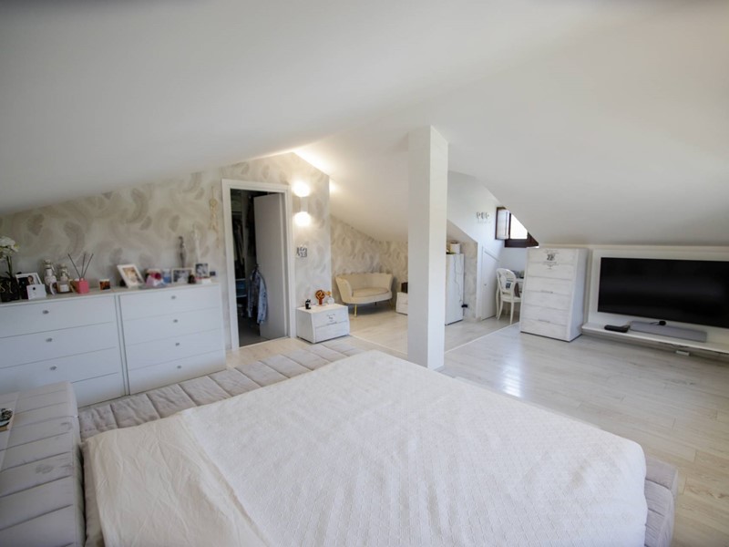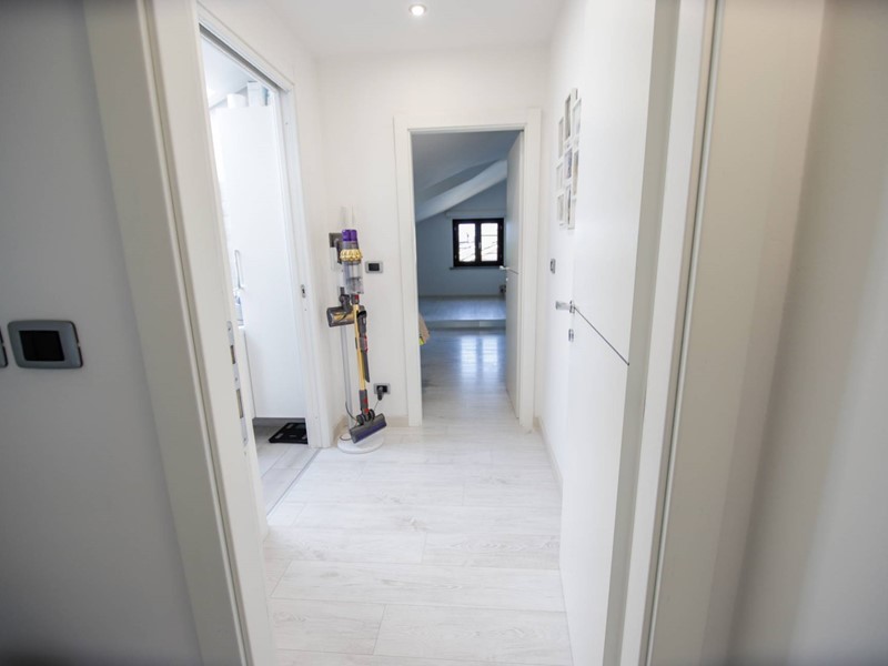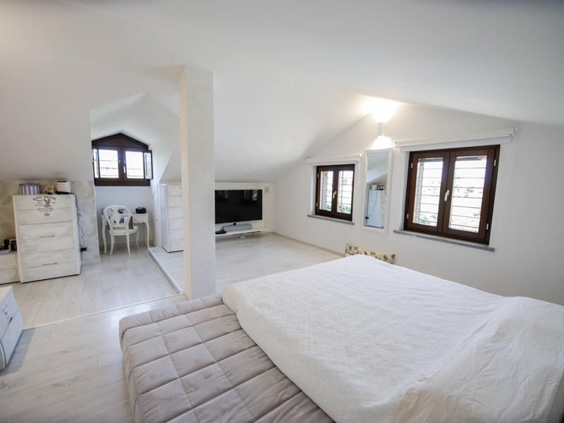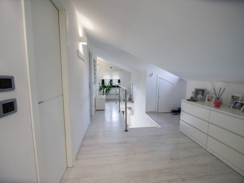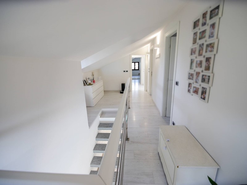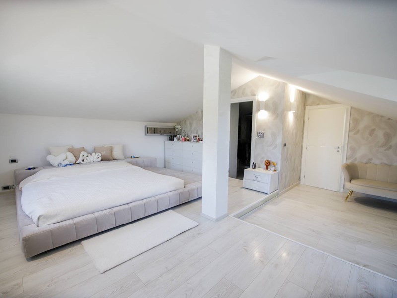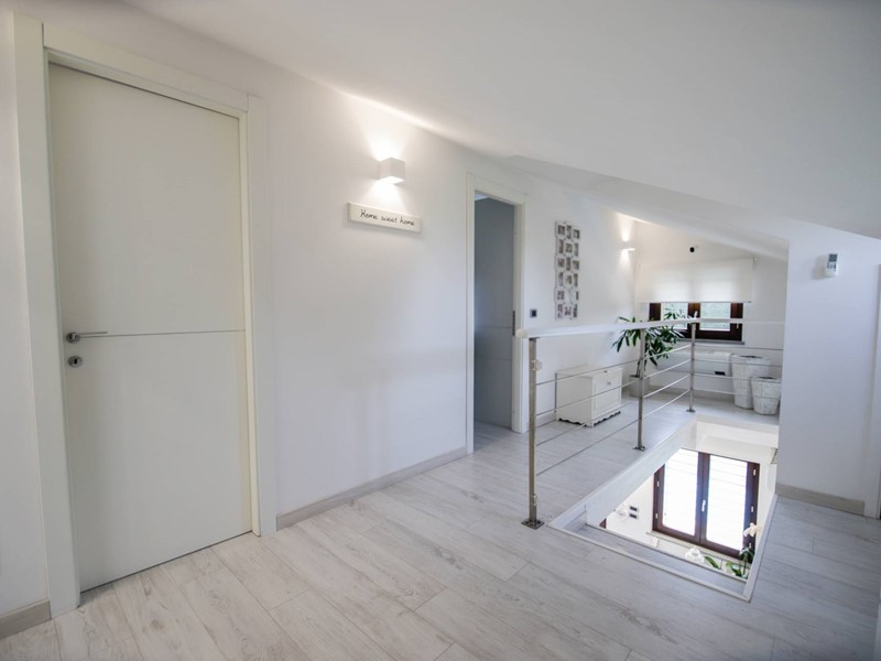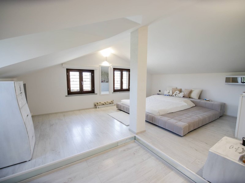 Al piano superiore, collegato da una moderna scala con gradini sospesi in pietra naturale, troviamo due camere da letto, una suite matrimoniale con ampia cabina armadi e un secondo bagno.