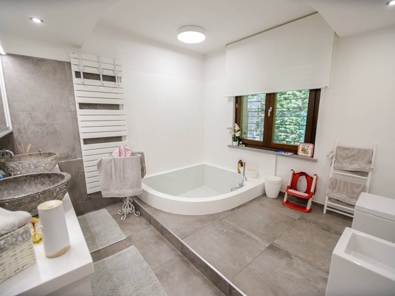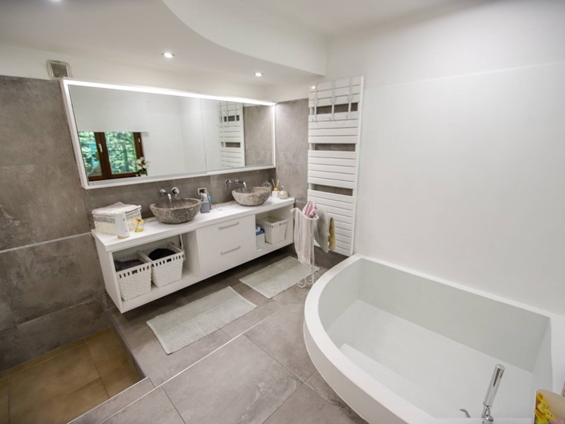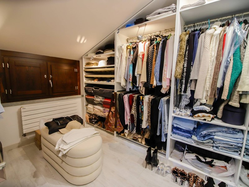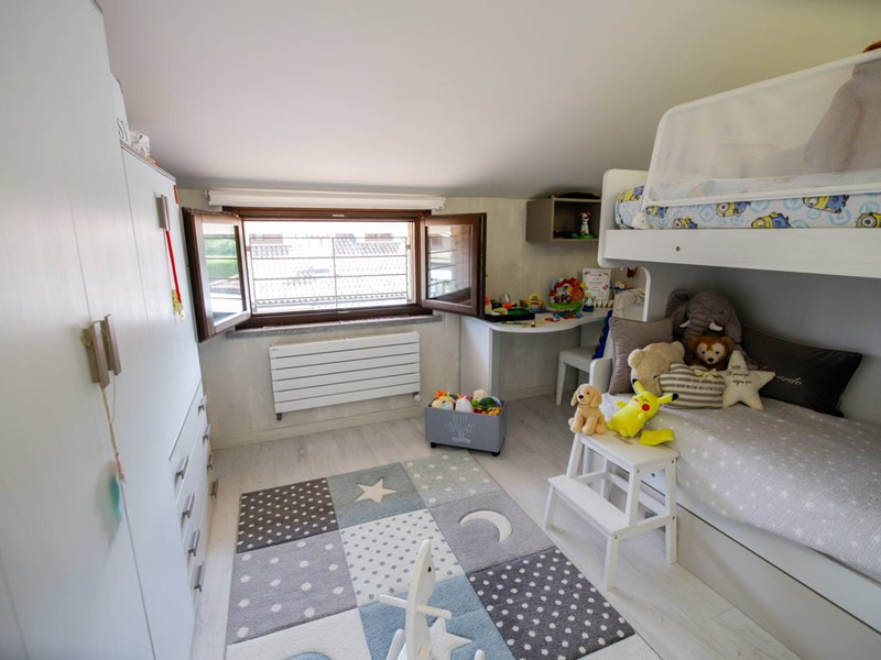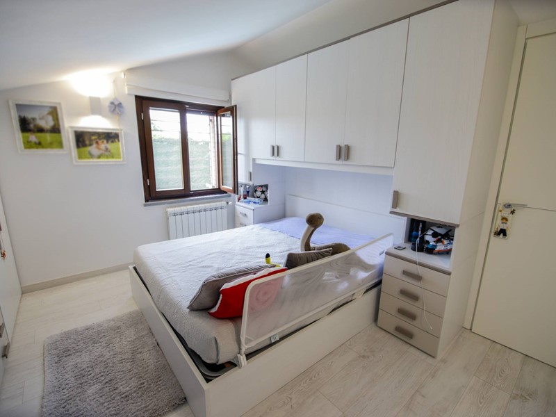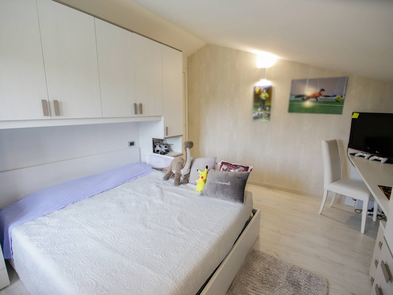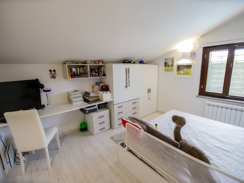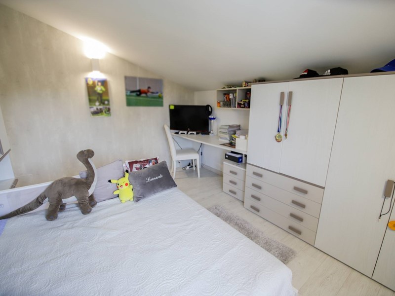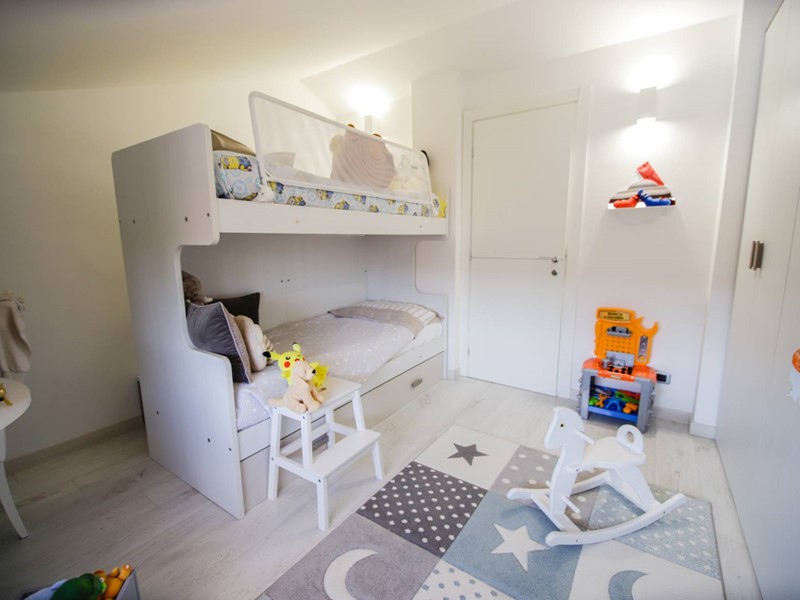Al piano superiore, collegato da una moderna scala con gradini sospesi in pietra naturale, troviamo due camere da letto, una suite matrimoniale con ampia cabina armadi e un secondo bagno.