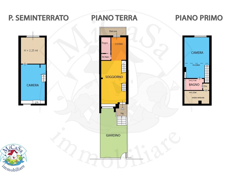 - Piano terra: soggiorno con cucina a vista, salottino separato e bagno di servizio
