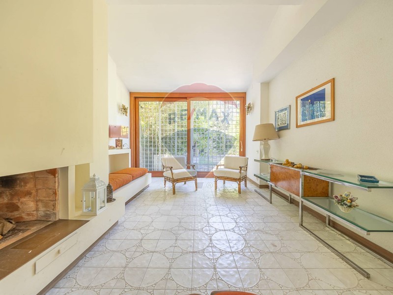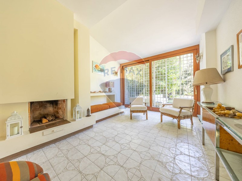 L'ingresso principale conduce ad un ampio e accogliente soggiorno con camino e accesso diretto al giardino privato, ottimo per trascorrere momenti di relax all'aperto.