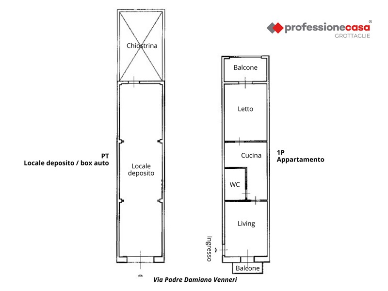 L'abitazione si sviluppa in lunghezza ed è composta da un comodo ingresso sulla zona giorno con affaccio su Via Padre Damiano Venneri tramite un balconcino. Proseguendo si trovano un bagno e una graziosa cucina abitabile dotata di camino e lucernario. La camera da letto matrimoniale affaccia internamente sulla chiostrina sottostante.