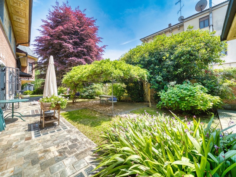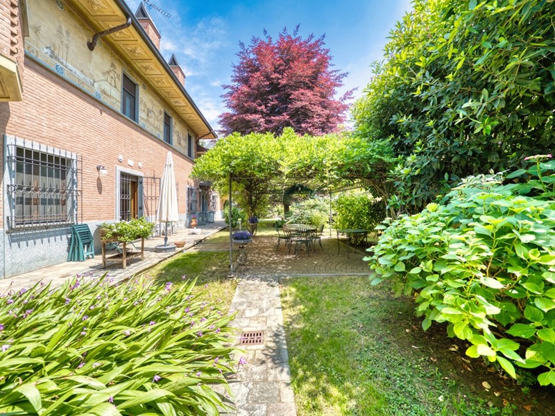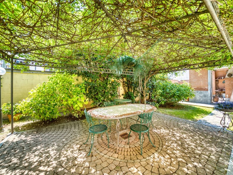 Il giardino, ampio e ben curato, è impreziosito da un maestoso albero di faggio, una pergola ricoperta da vegetazione che crea un'area ombreggiata ideale per pranzi all'aperto e una zona barbecue con forno. L'accesso carraio è dotato di cancello elettrico e consente nella corte il parcheggio di 2-3 auto