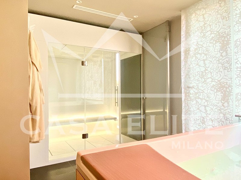ð¹ Piano Terra | Oasi di relax e design | Soggiorno con ampie vetrate e camino, accesso alla zona spa privata con mini piscina idromassaggio Teuco, bagno turco, doccia Moma Design con cromoterapia e soffitto stellato a led. Cucina Arclinea di pregio, studio/camera, cantinetta vini, bagno e lavanderia completano il piano.