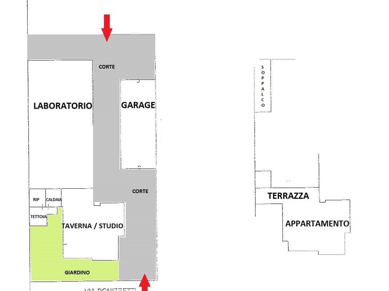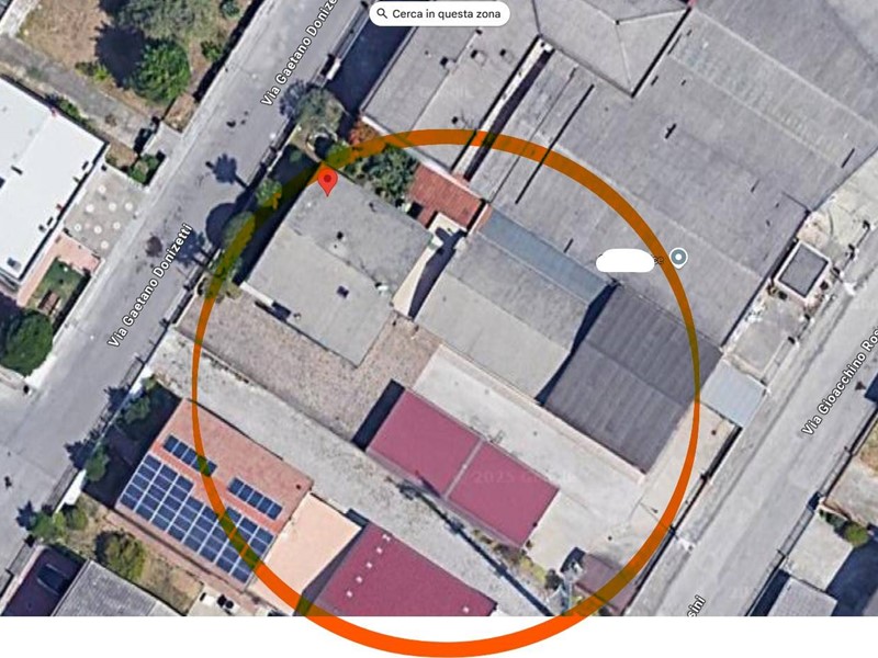 Capannone di circa 320 mq. composto da due grandi locali di cui uno a doppia altezza con carroponte della portata di 1 T. Soppalco interno con uffici, bagno. Altro locale deposito da utilizzare a seconda delle esigenze. Entrata principale per furgoni e camion, entrata pedonale. Riscaldato parzialmente con caldaia autonoma e termosifoni. Attorno al capannone un comodissimo piazzale che congiunge la via Donizetti con la via Rossini.