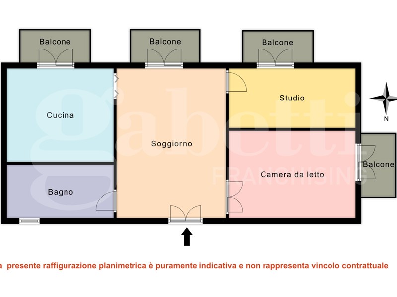 Attualmente si compone da ingresso su soggiorno, cucina abitabile, camera da letto, studio e ampio bagno finestrato. Tutte le stanze sono dotate di balcone ad eccezione del servizio.