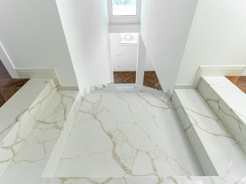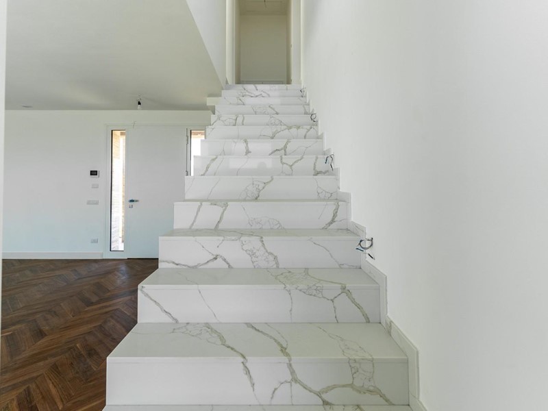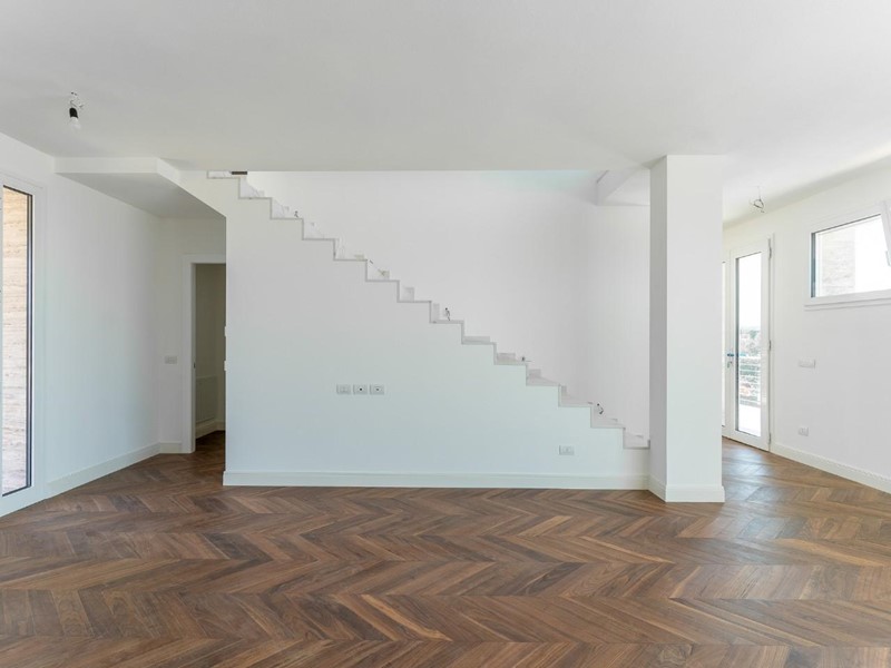Cancello elettrico, predisposizione allarme. Parquet a spina francese, scala interna in marmo di Calacatta Firenze. Vetri con predisposizione allarme e a controllo solare.