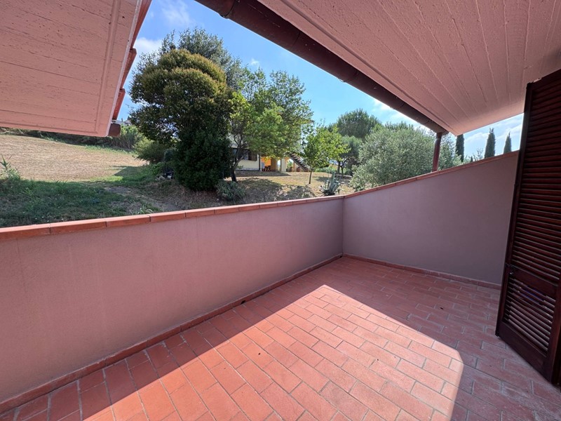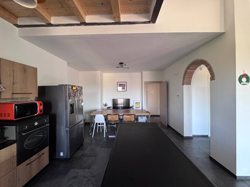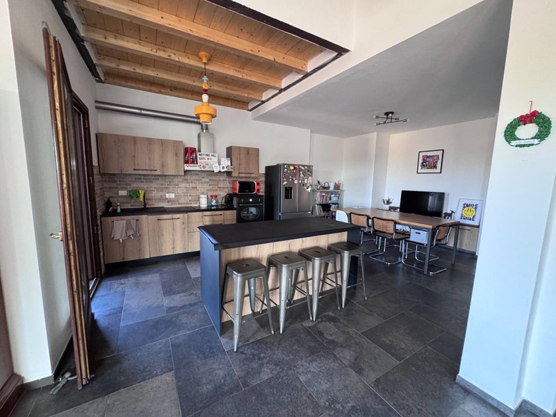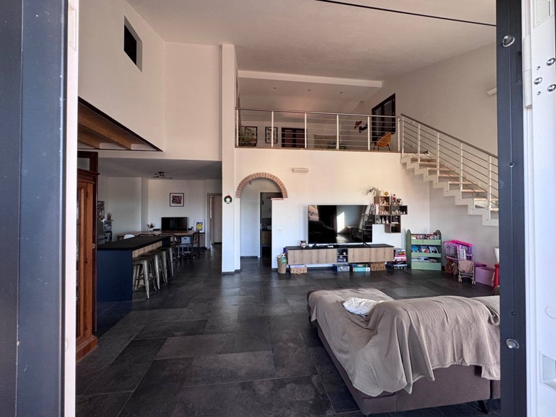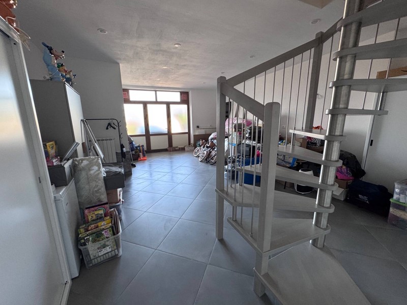 al piano terreno da loggiato posto sul lato Sud, soggiorno open space con cucina a vista (canna fumaria già esistente con possibilità di poter realizzare un camino), disimpegno notte, due camere da letto, primo bagno con doccia e porta-finestra con uscita verso l'esterno, botola con scala a chiocciola per scendere al piano interrato;