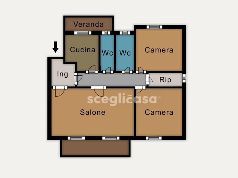 L'immobile ha una metratura interna di 122 mq ed è composto da ingresso , salone doppio , due ampie camere da letto , ripostiglio , cucina abitabile con veranda e due bagni.
