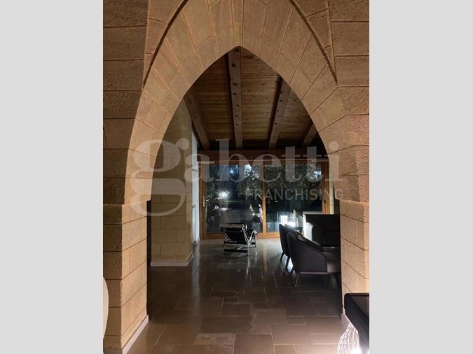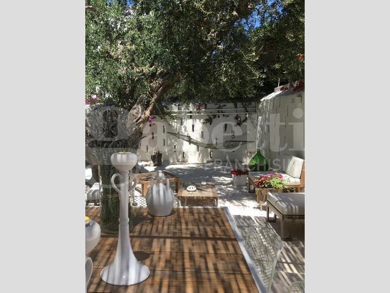 Volte in carparo, pavimentazione in pietra di Trani, ampie zone d'ombra e terrazze panoramiche con veduta sul giardino e sulla piscina.