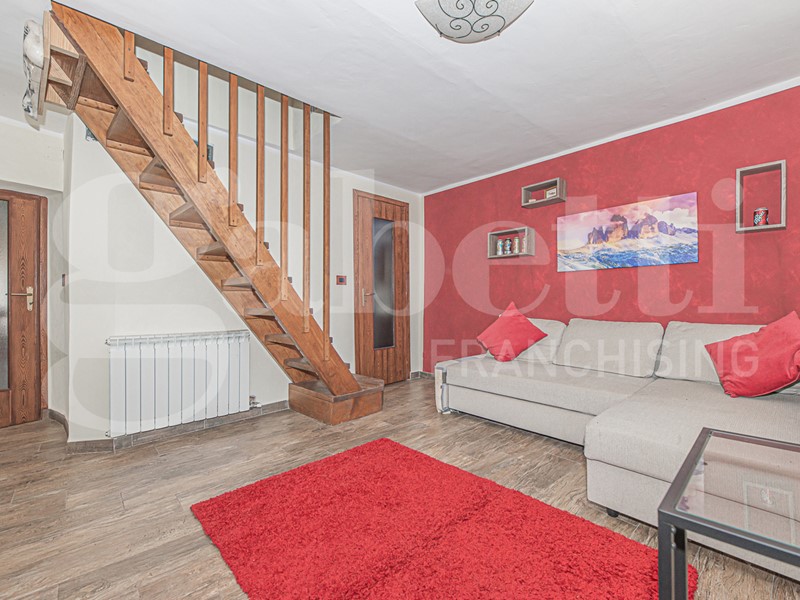 Una scala in legno conduce al piano superiore e alle due camere da letto, di cui una con accesso diretto al secondo bagno. La casa dispone inoltre di due balconi, ideali per godersi il panorama circostante e trascorrere piacevoli momenti all'aria aperta.
