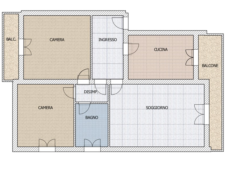 L'immobile è composto da ampio ingresso, cucina abitabile con accesso al balcone, luminoso soggiorno anch'esso con accesso al balcone, disimpegno notte con bagno, due camere da letto matrimoniali una delle quali con balcone che affaccia sul giardino.