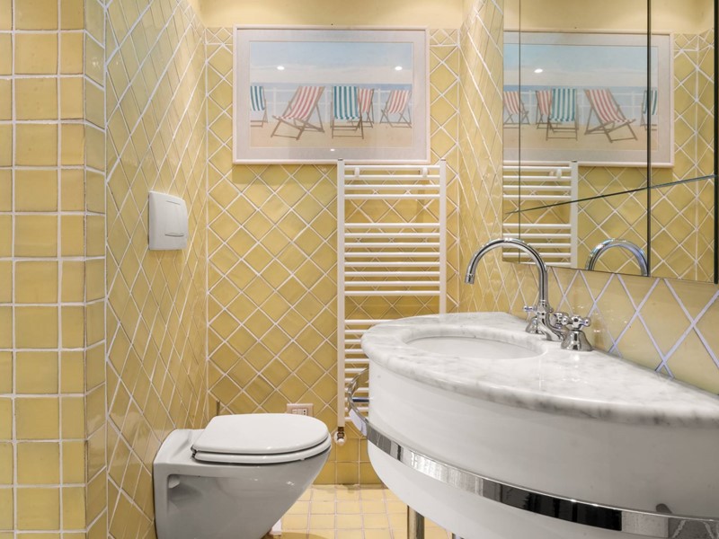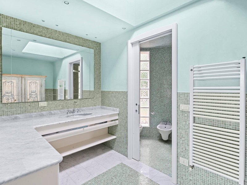 Una scenografica scala in marmo conduce al piano superiore, riservato alla zona notte. Qui si trovano due camere da letto, entrambe dotate di bagno privato, di cui una con cabina armadio: ambienti intimi, raffinati e pensati per garantire il massimo comfort e la totale privacy. I toni chiari, le sfumature pastello e la luce naturale che avvolge ogni ambiente donano agli interni unatmosfera luminosa e rilassante, in perfetta continuità con il verde e lazzurro esterni.