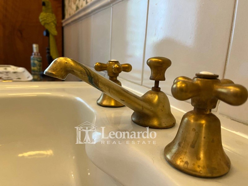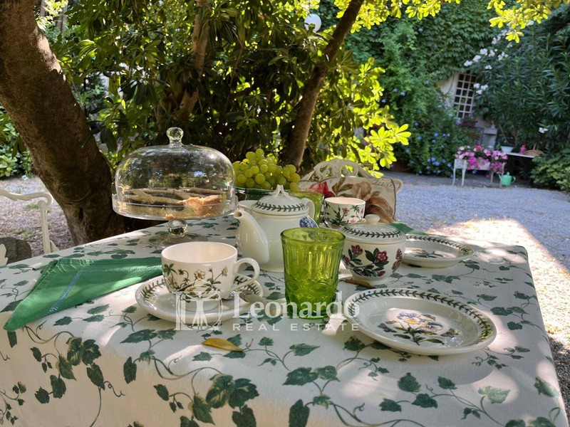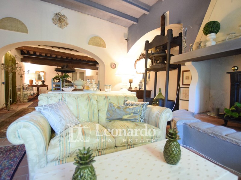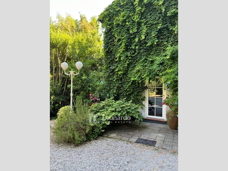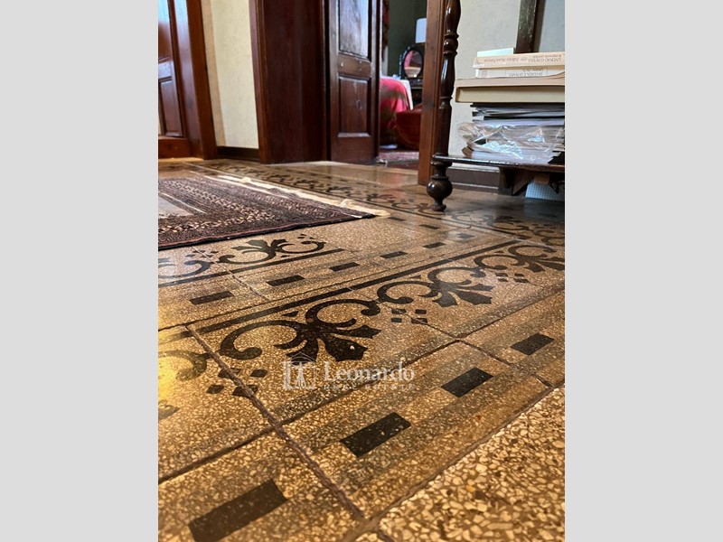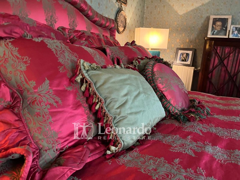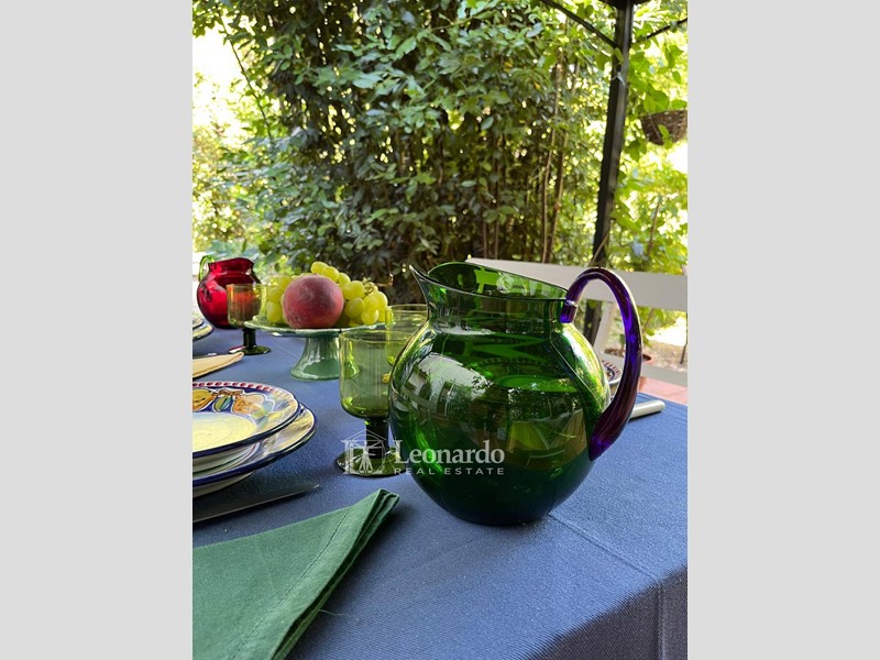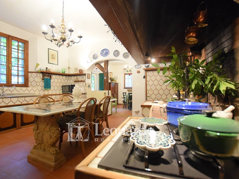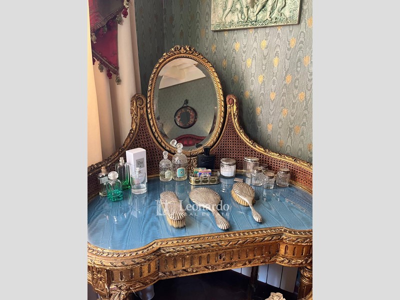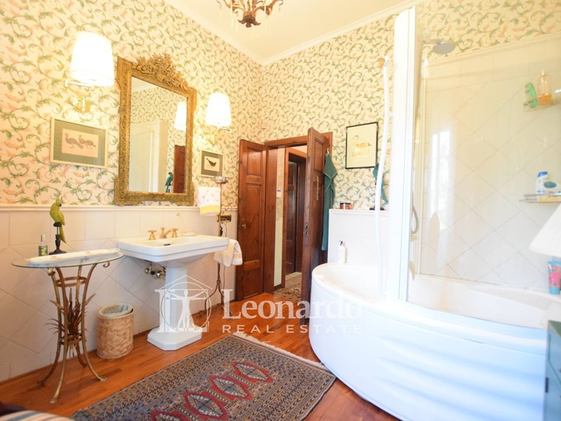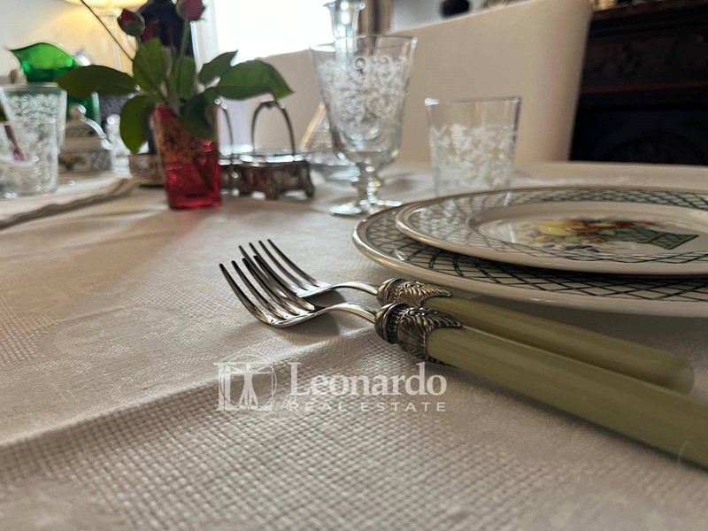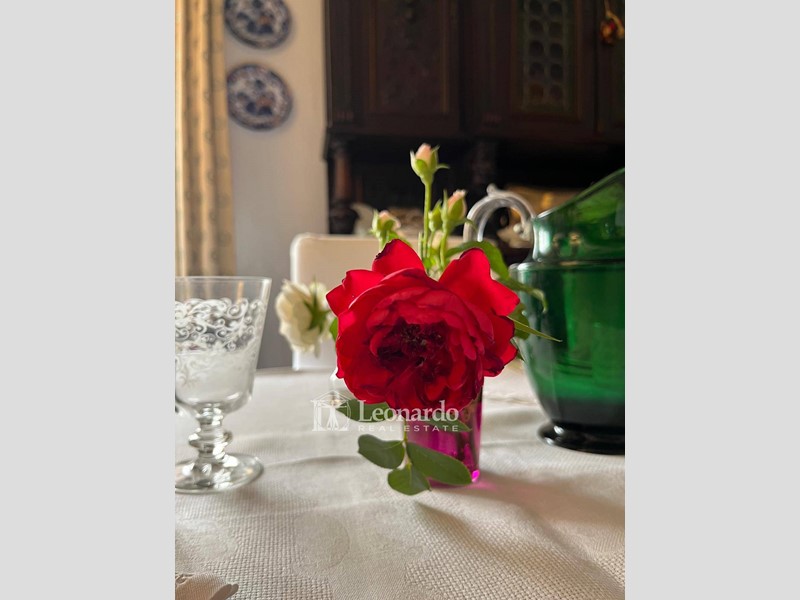 Allinterno, il piano terreno si apre con un elegante disimpegno che introduce nella zona giorno: una doppia sala da pranzo con camino in pietra grigia e pavimenti in parquet, una cucina dallanima autentica con fuochi rifiniti da piastrelle francesi, forno a legna, dispensa, seconda cucina e bagno, in un continuo gioco di livelli e prospettive tipico delle residenze depoca. Le finestre si affacciano sul giardino, inondando di luce naturale ogni ambiente.