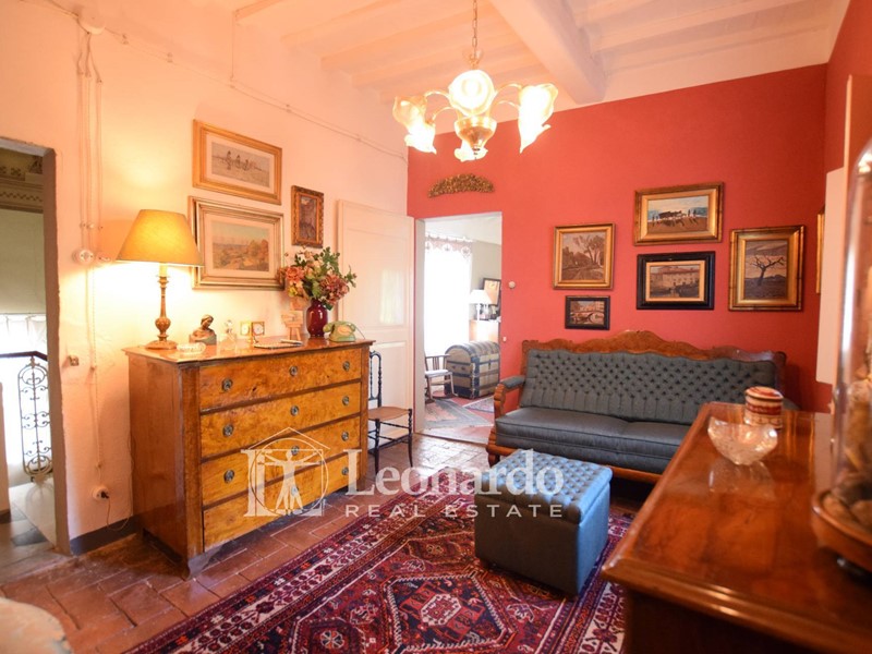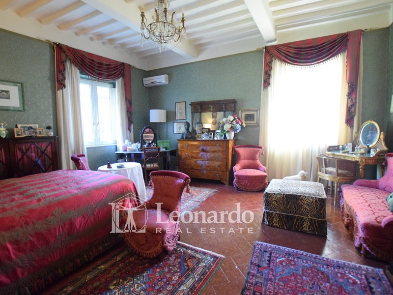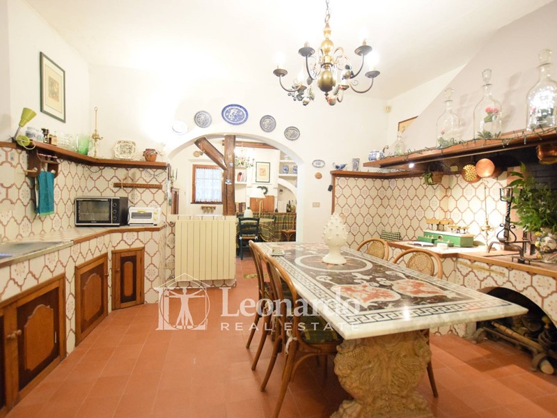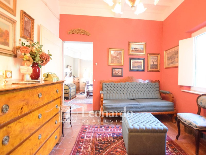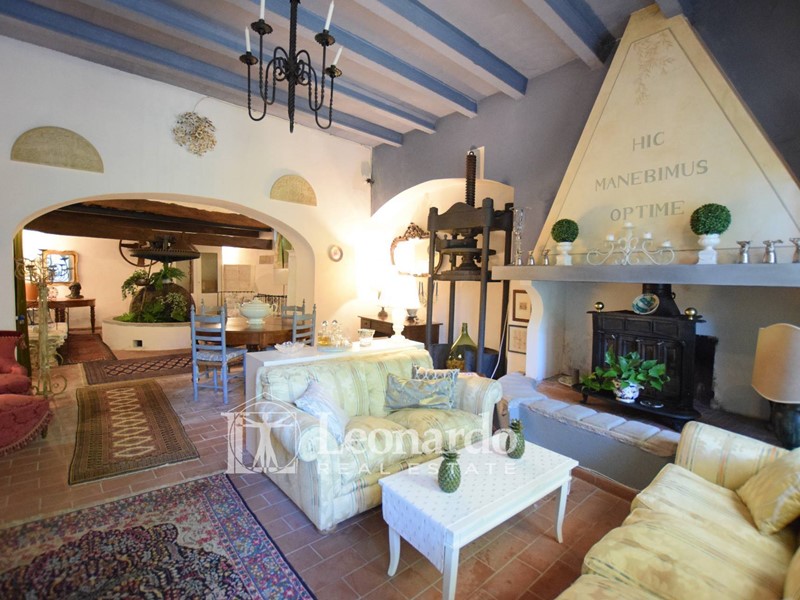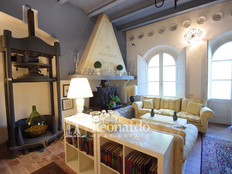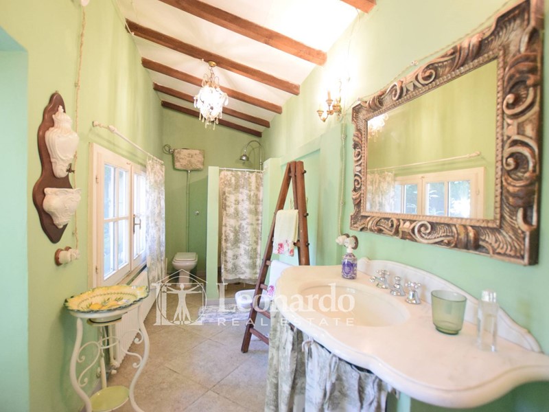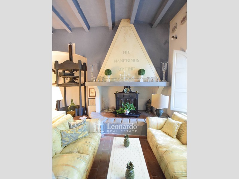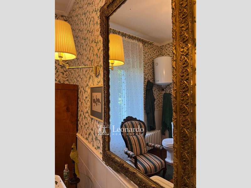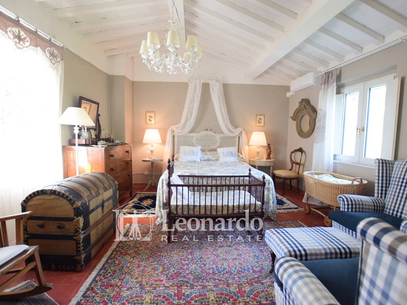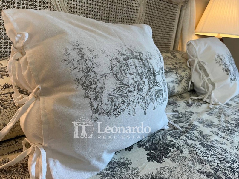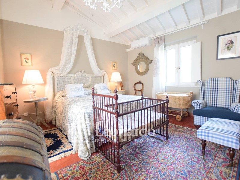 Allinterno, il piano terreno si apre con un elegante disimpegno che introduce nella zona giorno: una doppia sala da pranzo con camino in pietra grigia e pavimenti in parquet, una cucina dallanima autentica con fuochi rifiniti da piastrelle francesi, forno a legna, dispensa, seconda cucina e bagno, in un continuo gioco di livelli e prospettive tipico delle residenze depoca. Le finestre si affacciano sul giardino, inondando di luce naturale ogni ambiente.