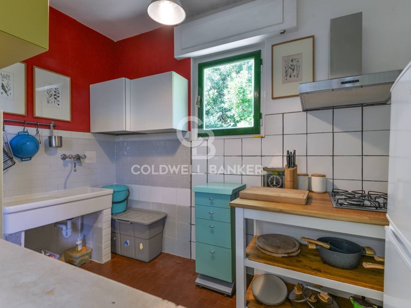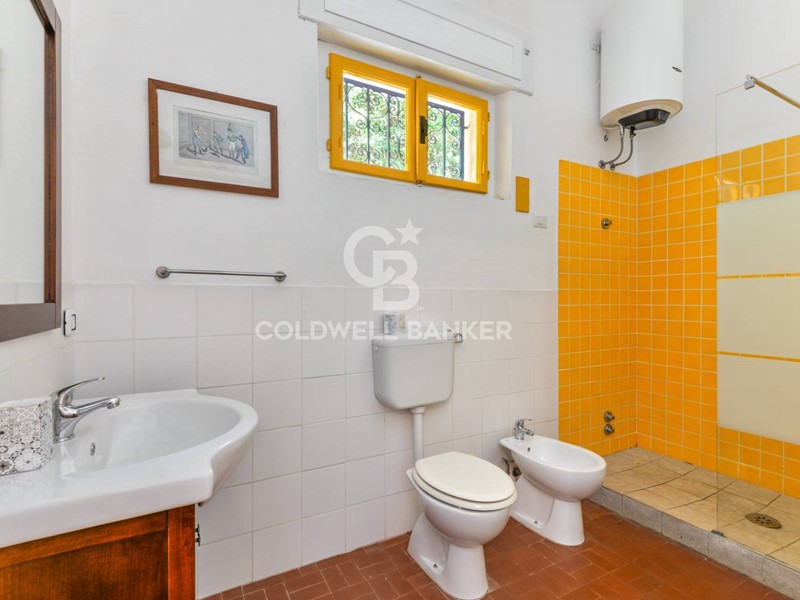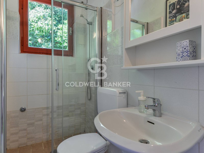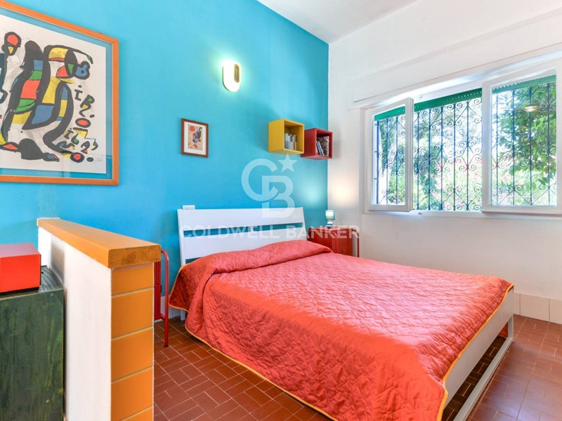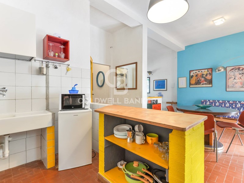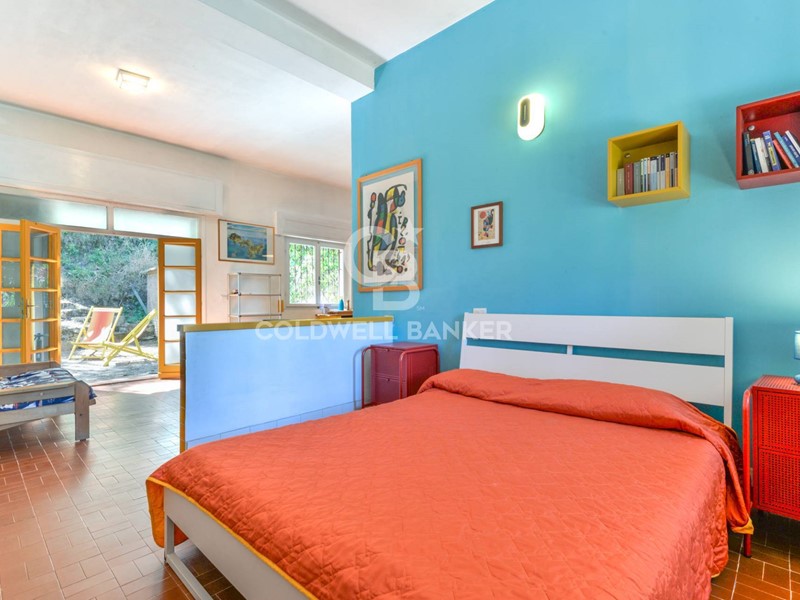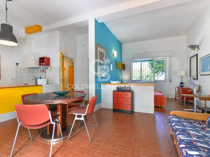 Al piano superiore, labitazione principale offre un luminoso soggiorno con camino e balcone vista mare, cucina abitabile, due camere da letto e bagno finestrato.