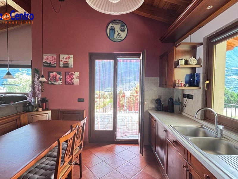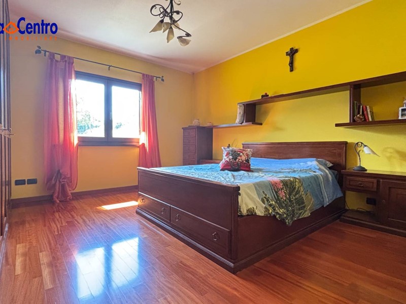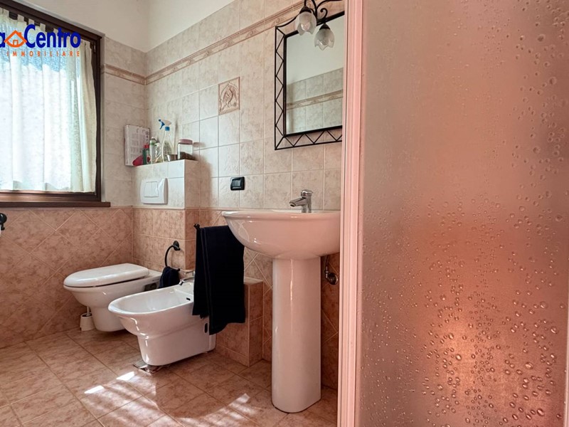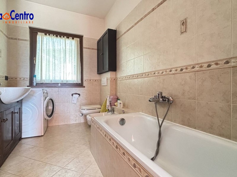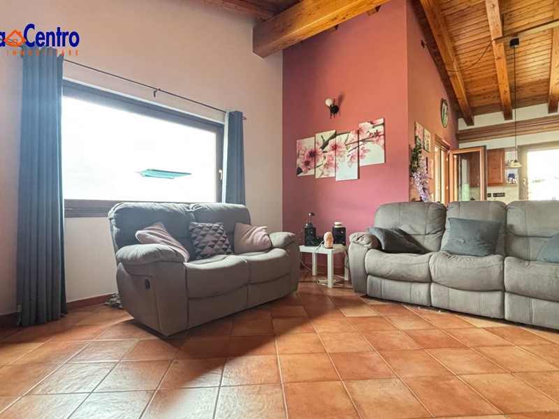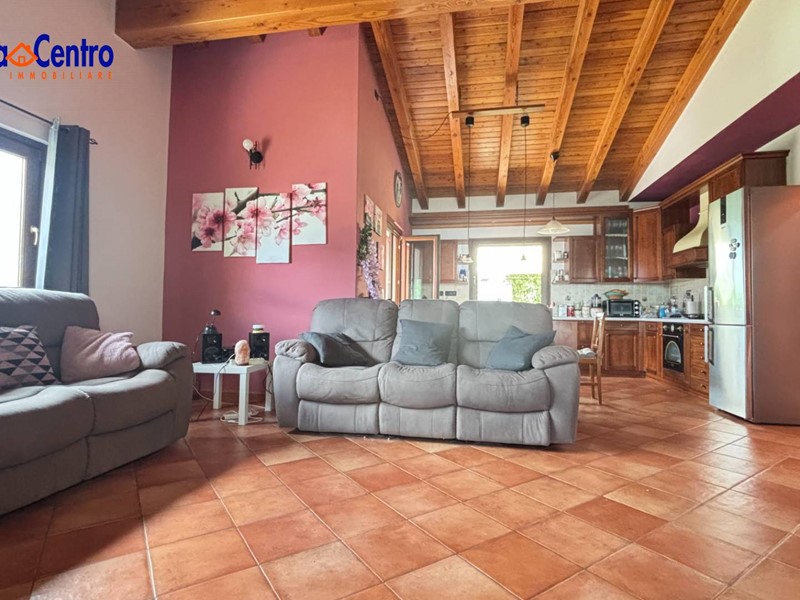 Una scala interna collega l'autorimessa agli altri due piani: al piano terra troviamo l'abitazione principale, alla quale si può accedere anche dall'ingresso esterno, dal disimpegno in cui si entra sia provenendo dall'interrato, sia entrando dal portoncino blindato, si accede a tutte le altre stanze. L'ampia zona giorno, esposta a sud è dotata di tre grandi finestre e una porta finestra che rendono questa zona della villa molto luminosa, un lato è adibito a soggiorno, nell'altro lato si trova una comoda cucina a vista dalla quale, attraverso la porta finestra, si accede sull'ampio terrazzo coperto che permette l'ingresso a tutta l'area verde, di circa 600 mq, che circonda la casa.